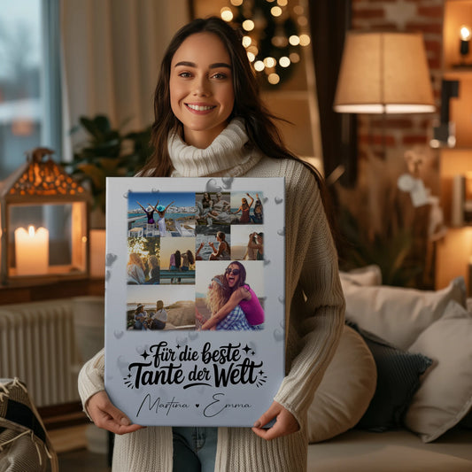 Unsere Geschenkideen für Tanten reichen von liebevoll gestalteten Fotocollagen-Kissen über elegante personalisierte Leinwandbilder bis hin zu praktischen bedruckten Tassen. Jedes Produkt kann individuell angepasst werden, um das perfekte individuelle Tanten Geschenk zu kreieren.