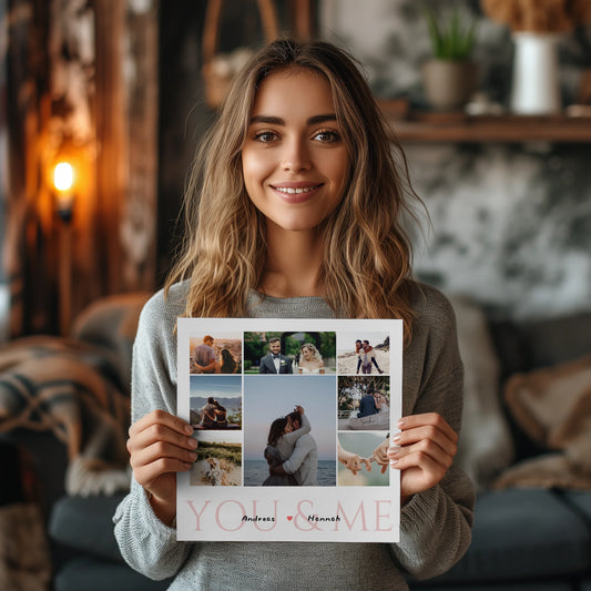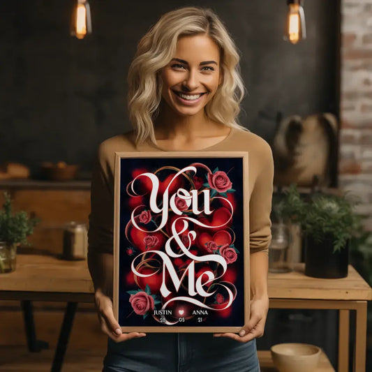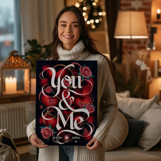 Unsere personalisierte Poster Verlobung und maßgeschneiderte Leinwände Verlobung sind perfekte Dekorationen für euer Zuhause. Zum Beispiel kannst du das Parchen Leinwand "You & Me" auswählen, um eure Liebe stilvoll zu präsentieren.