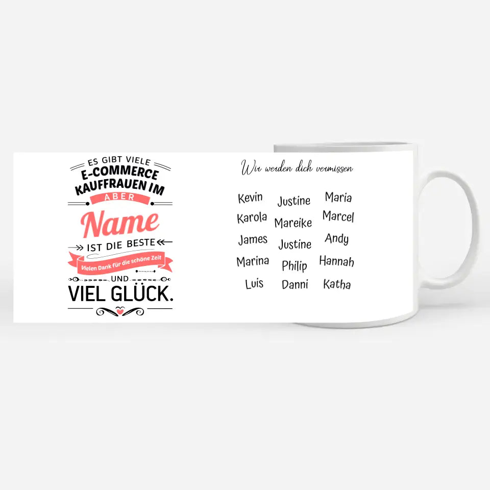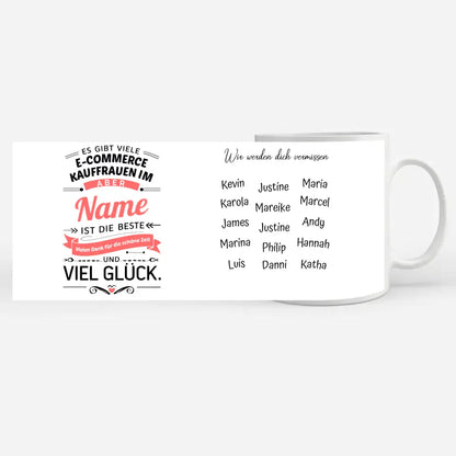 Abschiedsgeschenk Tasse mit Name für Kauffrauen im E-Commerce