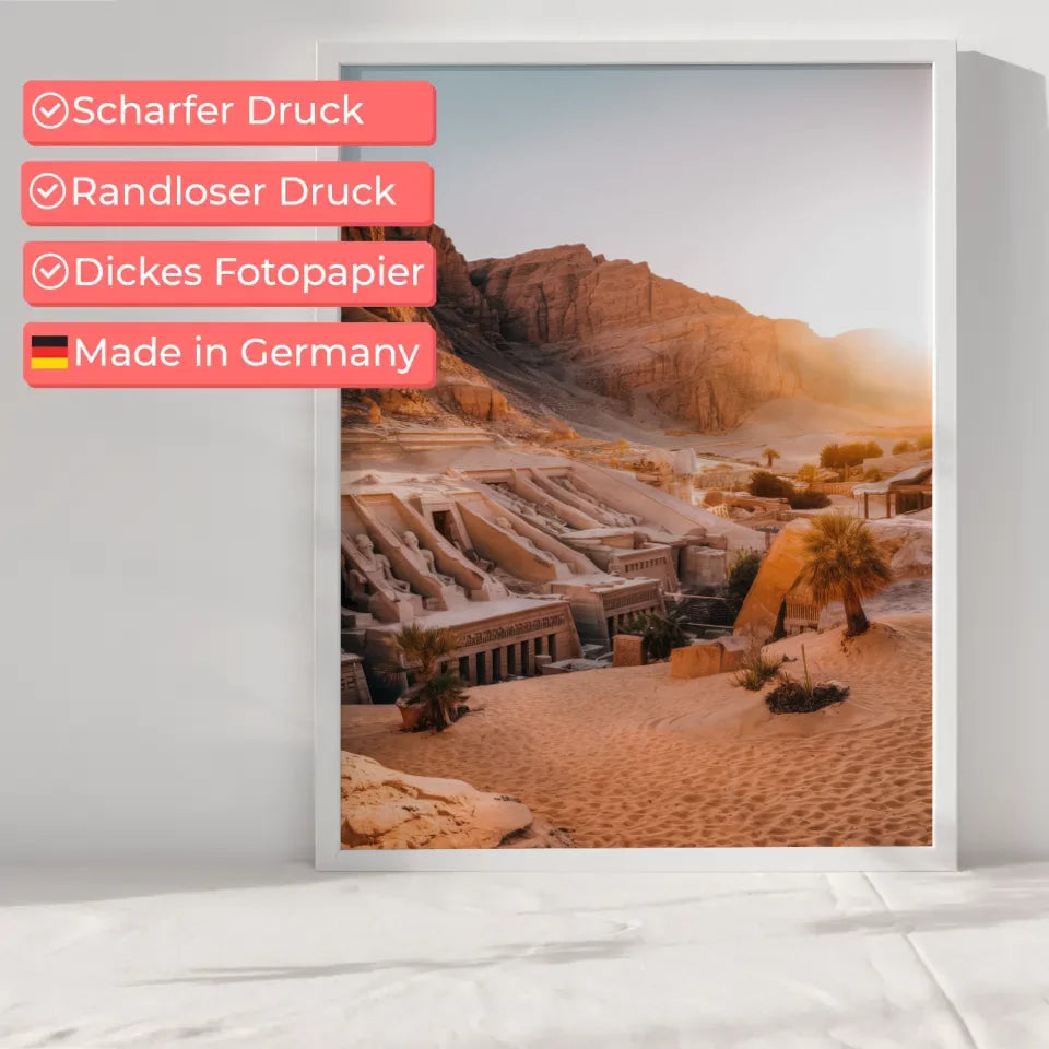 Das Poster überzeugt nicht nur durch seine Sichtbarkeit, sondern sorgt auch dafür, dass Ihre Räume an Charakter und Stil gewinnen. Die harmonischen Farben und detailreiche Darstellung machen das Poster Tal der Könige Ägypten Panoramafoto Goldene Stunde zum perfekten Highlight für jeden Raum – ob im Wohnzimmer, im Büro oder im Schlafzimmer. Es ist der ideale Blickfang, der Besucher ins Staunen versetzt und gleichzeitig eine beruhigende Atmosphäre schafft.