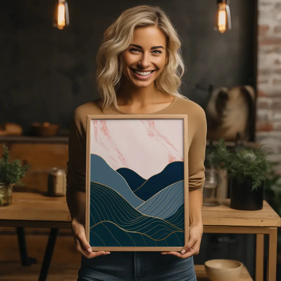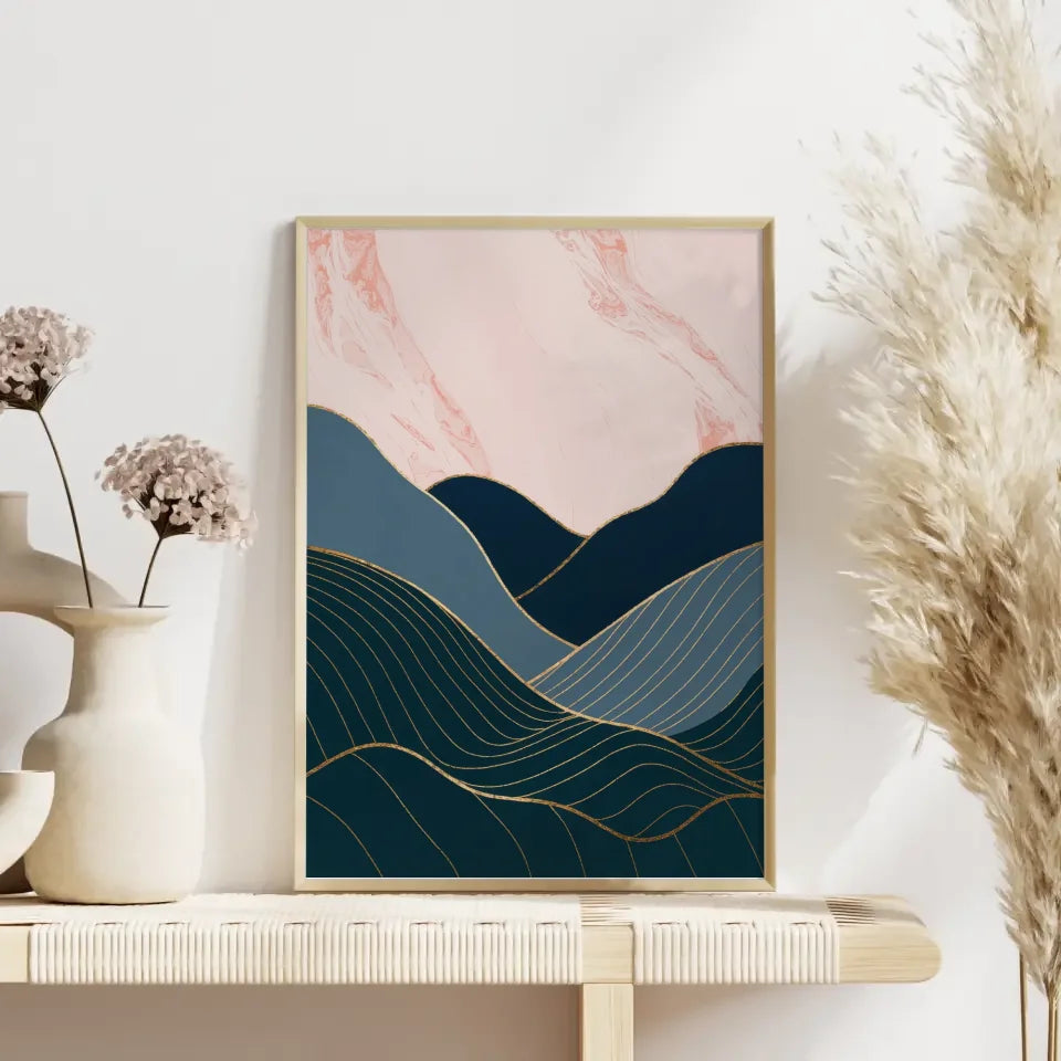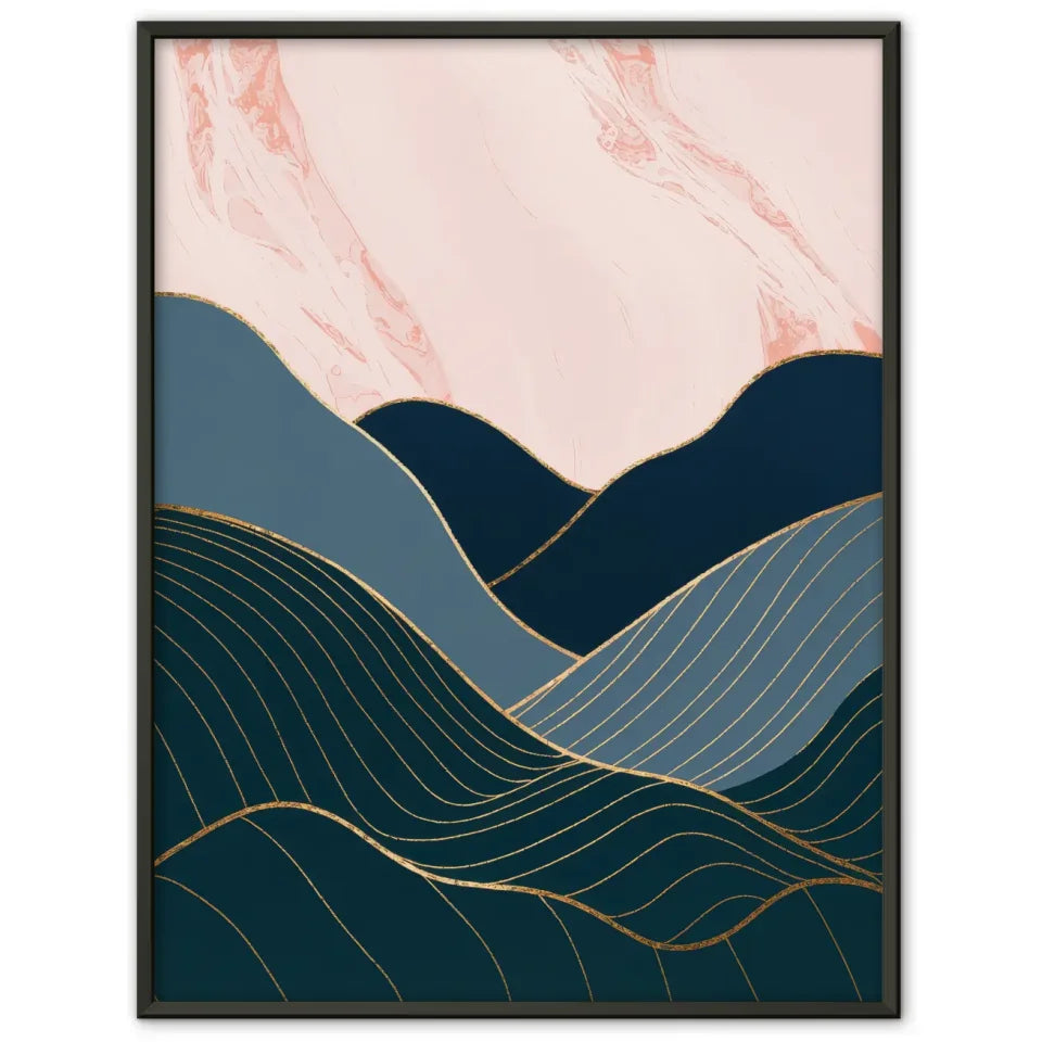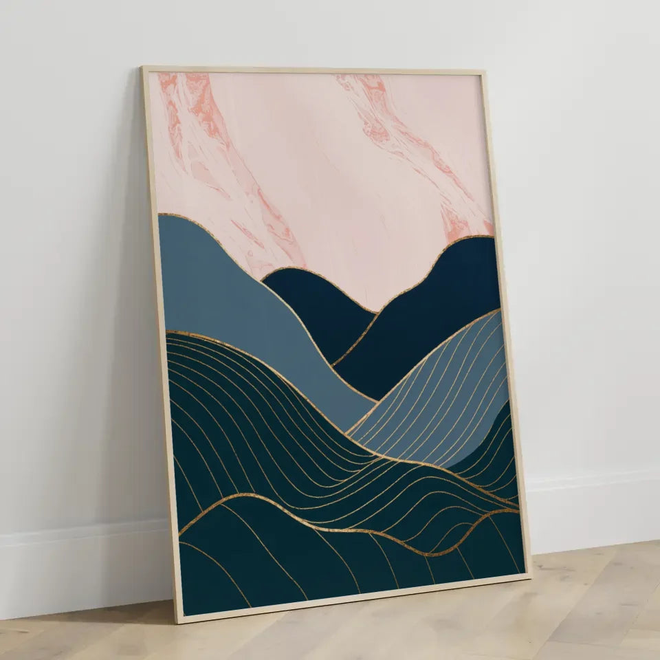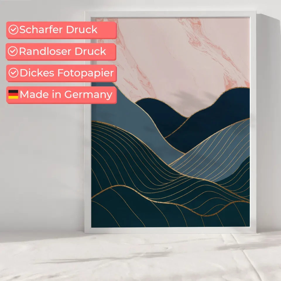 Entdecken Sie unser faszinierendes Abstrakte Landschaft Poster mit Hügeln und goldenen Wellenlinien, das Ihrem Wohnraum einen eleganten und kreativen Akzent verleiht. Dieses Poster besticht durch eine harmonische Darstellung einer ruhigen Landschaft, die durch sanfte Hügel und beeindruckende Berge geprägt ist. Die einzigartigen Wellenlinien in Gold im Vordergrund schaffen einen atemberaubenden Kontrast zu den dunkleren Blau- und Marine-Tönen der Hügel und Berge, wodurch ein Gefühl von Tiefe und Ruhe entsteht.