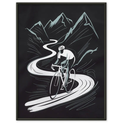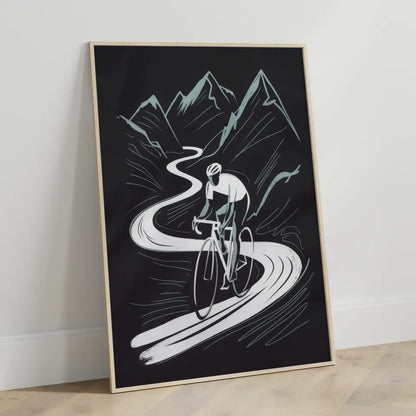 Entdecken Sie unser beeindruckendes Abstrakte Radfahrer Poster, das eine handgemalte Skizze eines Radfahrers zeigt, der auf kurvenreichen Bergpfaden navigiert. Dieses minimalistische Kunstwerk besticht durch die vereinfachte Silhouette des Radfahrers vor einem dunklen Hintergrund. Der Fokus liegt auf fließenden Linien und kräftigen Formen, die die Dynamik des Radsports perfekt einfangen.