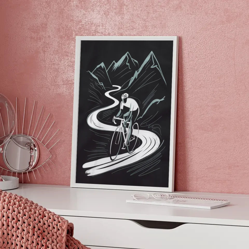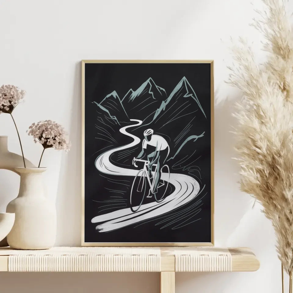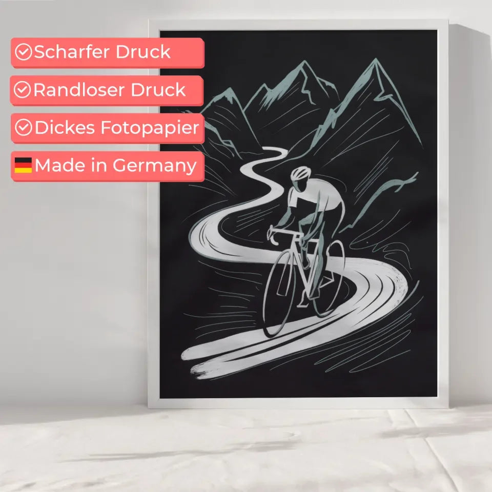 Unsere Poster sind mehr als nur Wanddekoration; sie sind ein Ausdruck von Leidenschaft und Stil. Das bergige Gelände wird kreativ mit Tiefe und Textur dargestellt, wodurch ein auffälliges Design entsteht, das jedem Raum Leben einhaucht. Das Abstrakte Radfahrer Poster ist ideal für moderne Wohnräume sowie für Fahrradliebhaber, die ihrem Zuhause eine künstlerische Note verleihen möchten.