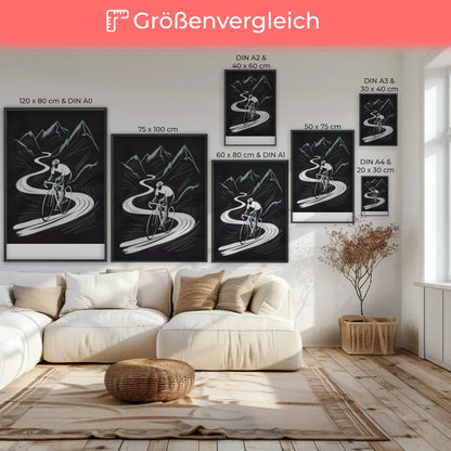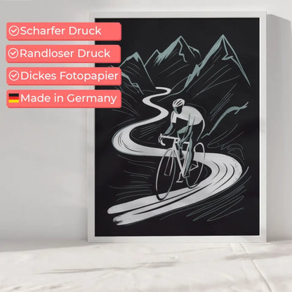 Wählen Sie aus einer Vielzahl von Formaten und bringen Sie mit unserem hochwertigen Poster einen Hauch von Minimalismus und modernem Flair in Ihre Einrichtung. Lassen Sie die dynamische Ästhetik des Radfahrers zur Inspiration in Ihrem Wohnbereich werden und genießen Sie den Blick auf dieses außergewöhnliche Kunstwerk.