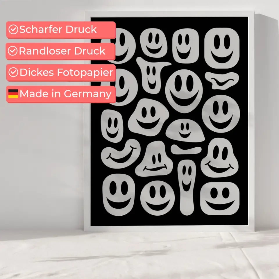 Entdecken Sie unsere einzigartigen Abstrakte Smiley Poster, die Ihrem Raum einen Hauch von Spaß und Stil verleihen. Diese Kunstwerke zeichnen sich durch eine diverse Sammlung stilisierter Smileys aus, die in verschiedenen Formen, Größen und Designs gestaltet sind. Das überwiegende Farbspiel in Weiß auf schwarzem Hintergrund schafft einen starken, auffälligen Kontrast, der die Blicke auf sich zieht. Die charakteristischen Gesichter lächeln freundlich mit zwei Augen und einem gebogenen Mund, sodass jedes Poster einen klaren und fröhlichen Ausdruck vermittelt. Die zufällige Anordnung der Smileys sorgt für eine verspielte und skurrile Atmosphäre, die in jedem Raum für Aufheiterung sorgt. Egal, ob in Ihrem Wohnbereich, Schlafzimmer oder Büro – die Abstrakte Smiley Poster sind der perfekte Akzent, um Ihre Wände lebendig und einladend zu gestalten. Bringen Sie mit diesen kreativen Kunstwerken Freude und Inspiration in Ihr Zuhause und machen Sie jeden Raum zu einem besonderen Ort.