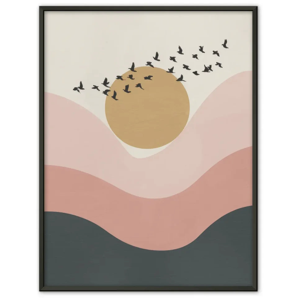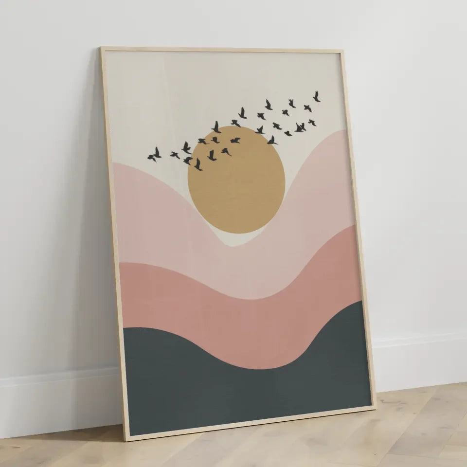 Abstrakter Landschafts Poster mit goldgelbem Kreis und Vögeln