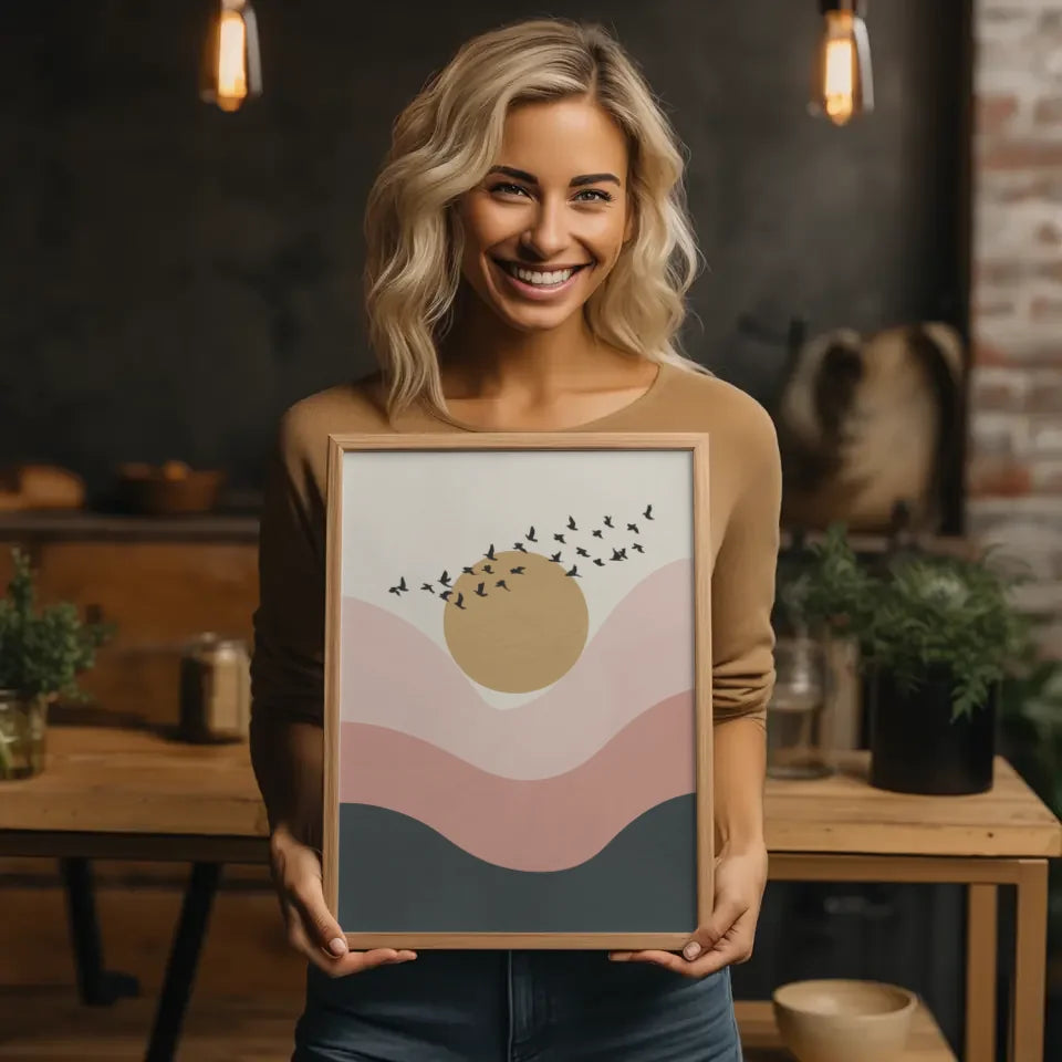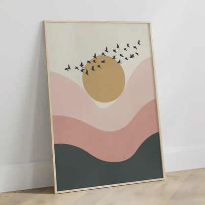 Bringen Sie die Schönheit der Natur und das Flair des Boho Stils in Ihre Wände, indem Sie unser abstraktes Landschafts Poster mit goldgelbem Kreis und Vögeln wählen. Gestalten Sie Ihre Wohnräume individuell und stilvoll – mit einem Poster, das Geschichten erzählt und Emotionen weckt.