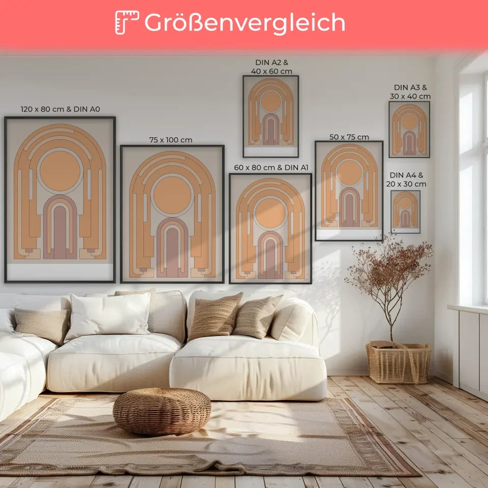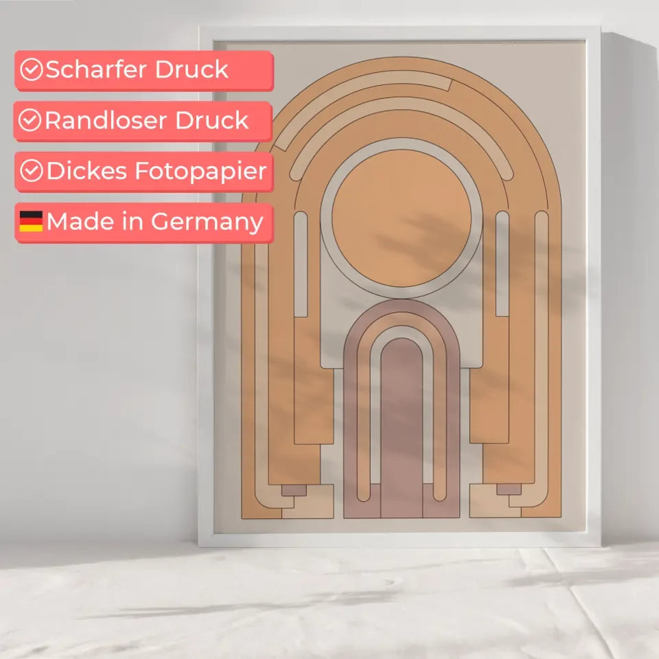 Entdecken Sie unseren einzigartigen abstrakten Poster mit Kreisform in Pfirsich und geschwungenen Linien, der Ihrem Wohnraum einen modernen Touch verleiht. Dieser wunderschöne Poster zeigt ein innovatives Design, das mit einem zentralen Kreis in einem sanften Pfirsich- oder Hellorangeton begeistert. Die geschwungenen Linien, die diesen Kreis umrahmen, sind in ähnlichen Farbtönen gehalten und bilden eine harmonische bogenartige Formation.