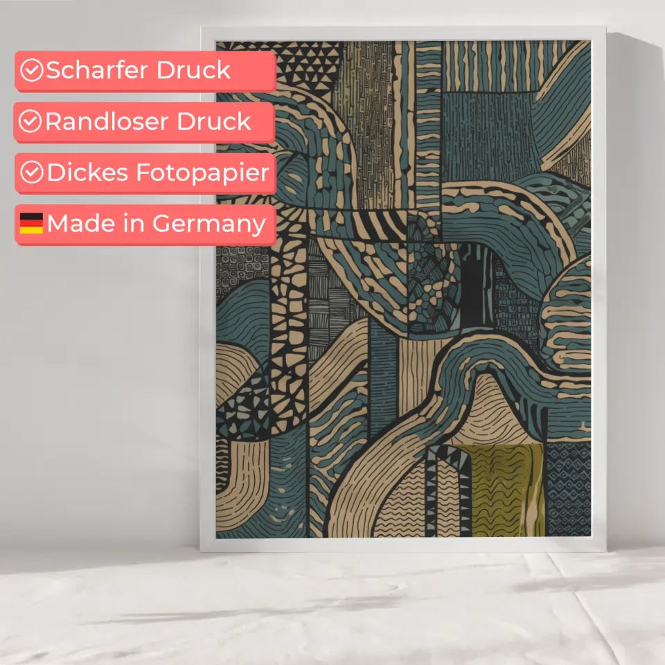 Entdecke unser einzigartiges abstraktes Poster mit lebendigem Muster in Blau und Grün für dein Zuhause. Dieses Poster bringt nicht nur Farbe, sondern auch eine dynamische Atmosphäre in jeden Raum. Die kunstvolle Komposition aus ineinander verschlungenen Linien, Wellen und geometrischen Formen sorgt für einen Blickfang, der garantiert die Aufmerksamkeit deiner Gäste auf sich zieht. Die harmonische Kombination aus Blau-, Grün- und Gelbtönen, ergänzt durch kontrastierende Schwarz-Weiß-Elemente, macht dieses Poster zu einem absoluten Highlight in deiner Wohnung.