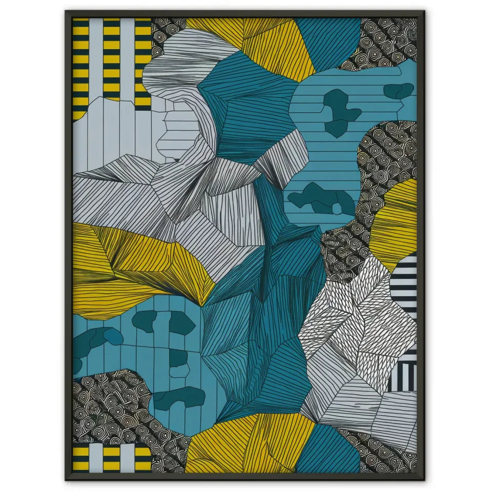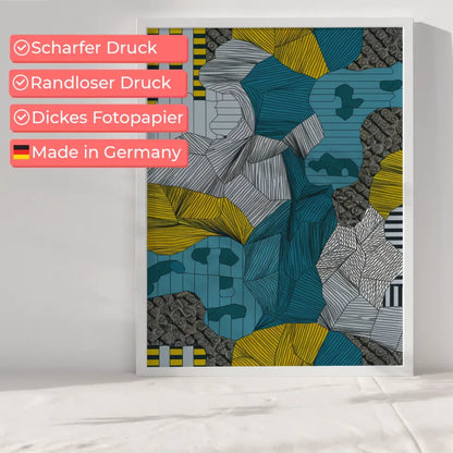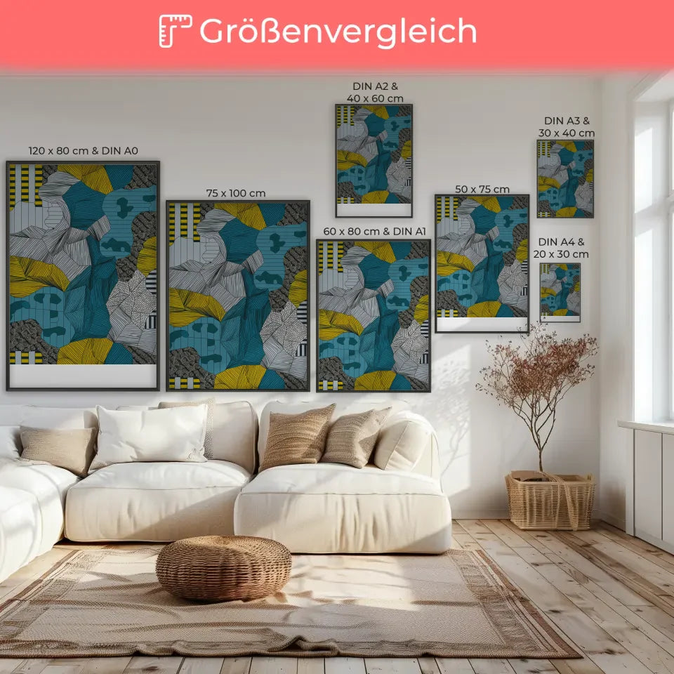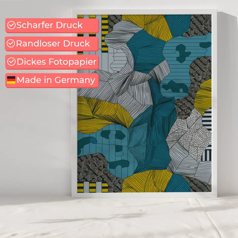Entdecke unser einzigartiges abstraktes Poster mit lebendigem Muster in Blau und Grün für dein Zuhause. Dieses Poster bringt nicht nur Farbe, sondern auch eine dynamische Atmosphäre in jeden Raum. Die kunstvolle Komposition aus ineinander verschlungenen Linien, Wellen und geometrischen Formen sorgt für einen Blickfang, der garantiert die Aufmerksamkeit deiner Gäste auf sich zieht. Die harmonische Kombination aus Blau-, Grün- und Gelbtönen, ergänzt durch kontrastierende Schwarz-Weiß-Elemente, macht dieses Poster zu einem absoluten Highlight in deiner Wohnung.