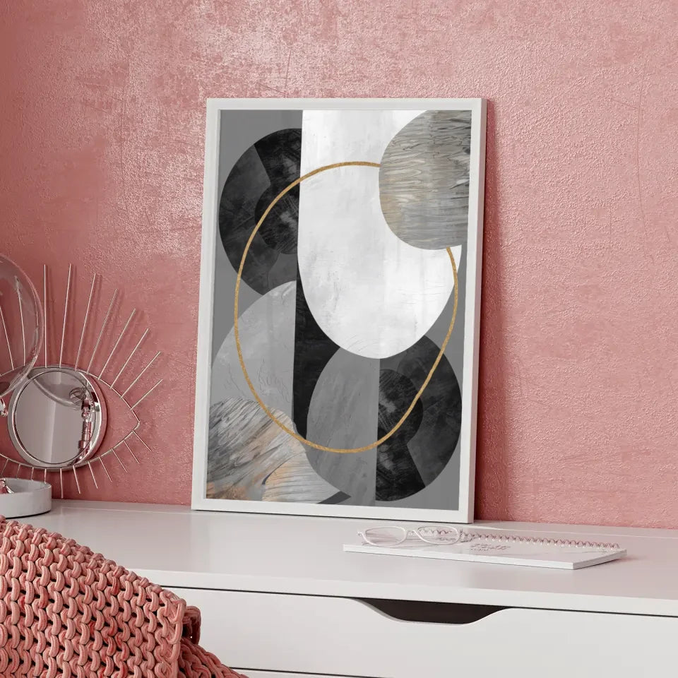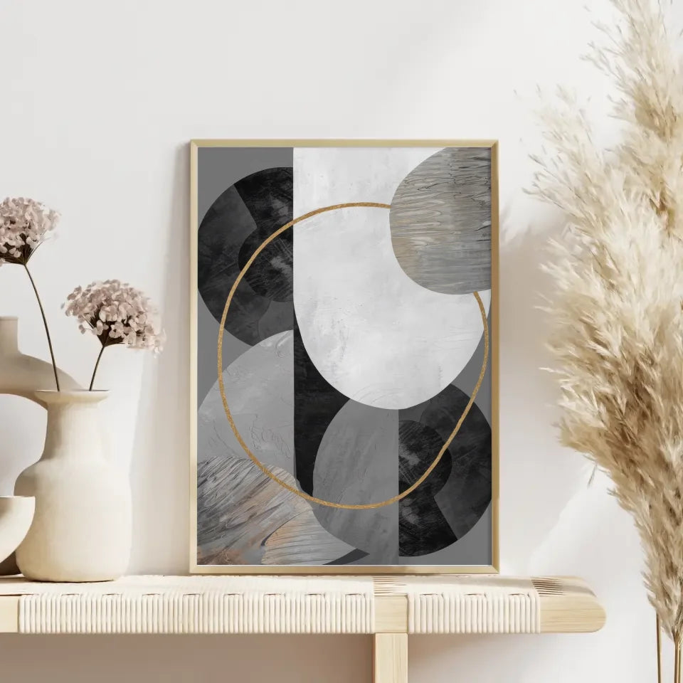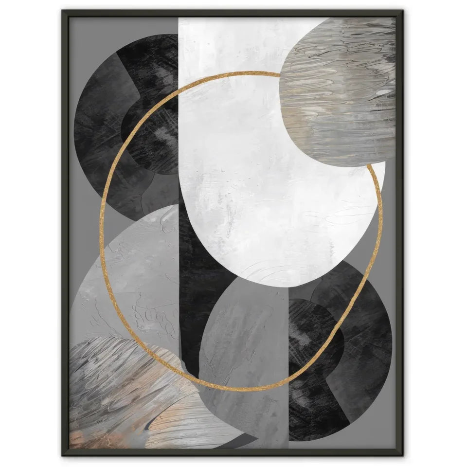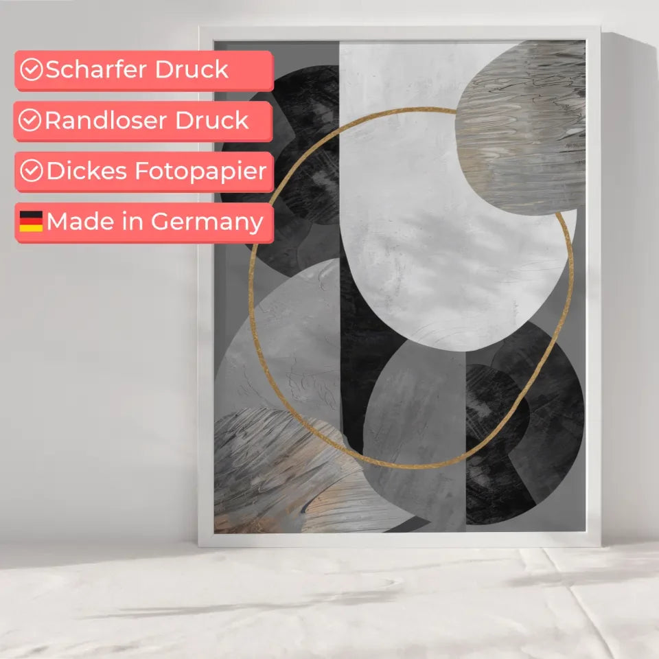 Entdecken Sie unser einzigartiges abstraktes Poster mit geometrischen Formen und minimalistischem Design, das Ihrem Zuhause eine moderne Note verleiht. Dieses Poster zeigt ein faszinierendes Kunstwerk, in dessen Zentrum ein großes weißes Oval steht, das umgeben ist von überlappenden schwarzen und grauen Kreisformen. Die feinen, goldenen, geschwungenen Linien, die die Formen umschlingen, erzeugen eine harmonische Verbindung und verleihen dem Kunstwerk eine besondere Eleganz.