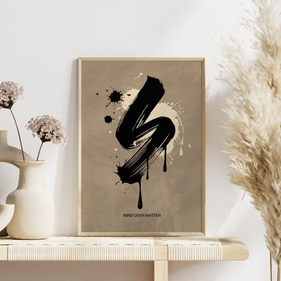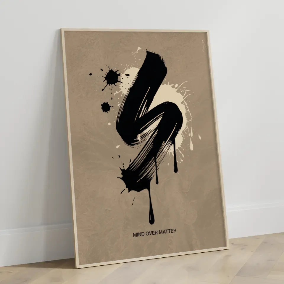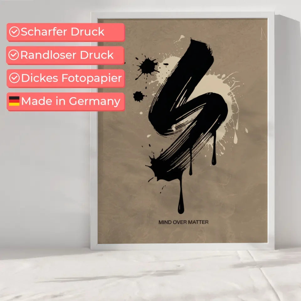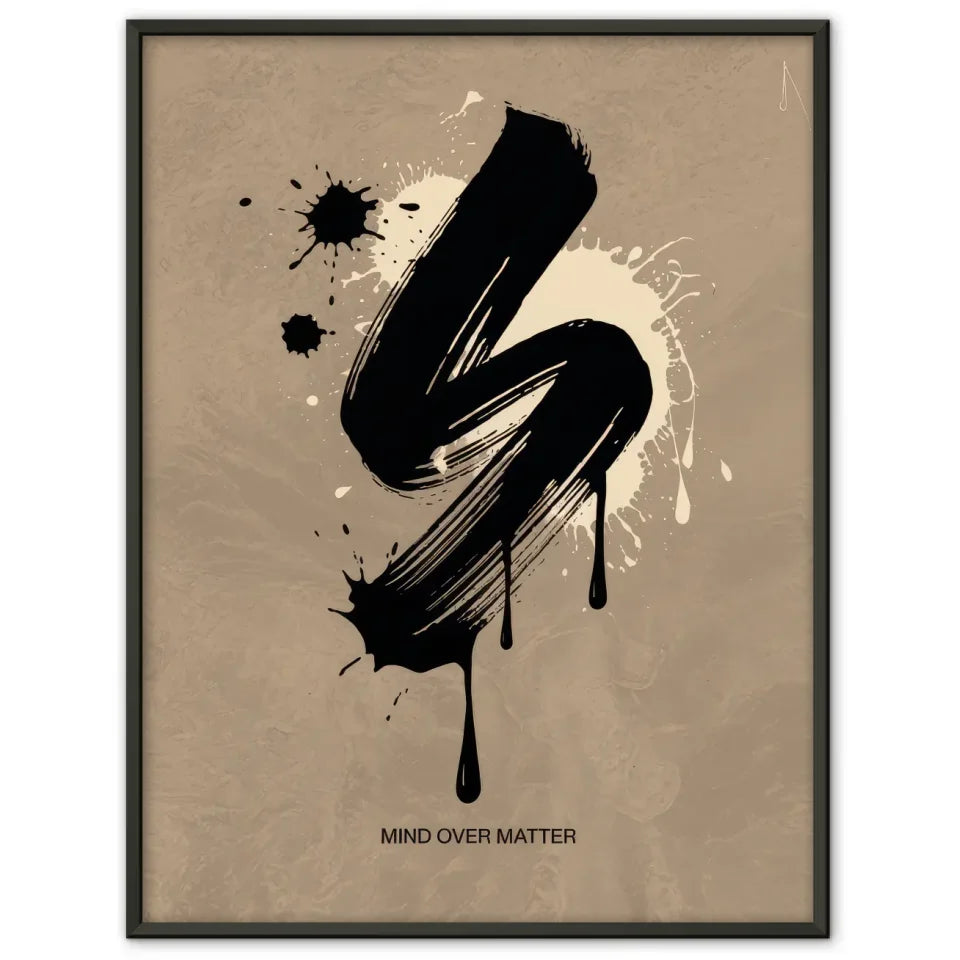 Zusätzlich verleiht das Design eine besondere Tiefe durch die verstreuten schwarzen Tintentröpfchen, die um den Pinselstrich angeordnet sind. Unten im Bild finden Sie das inspirierende Textelement 'MIND OVER MATTER“, das nicht nur als dekoratives Element dient, sondern auch eine motivierende Botschaft verbreitet. Dieses Poster ist nicht nur ein Kunstwerk, sondern auch eine Quelle der Inspiration und Energie für Ihr Zuhause oder Büro.
