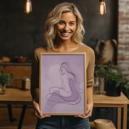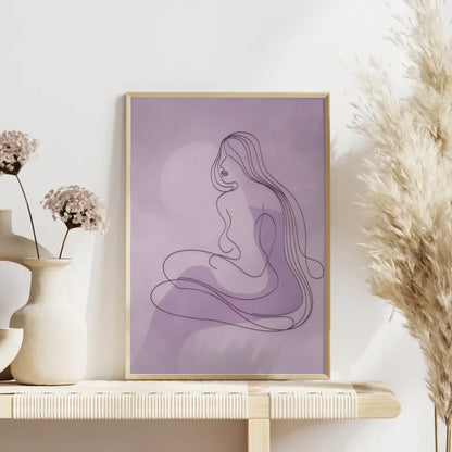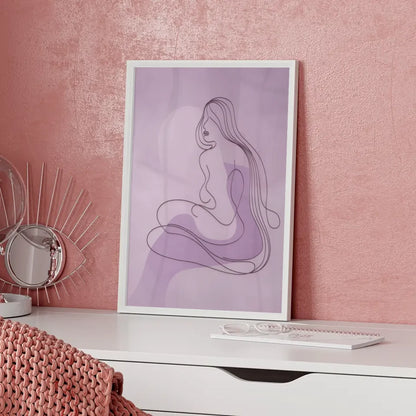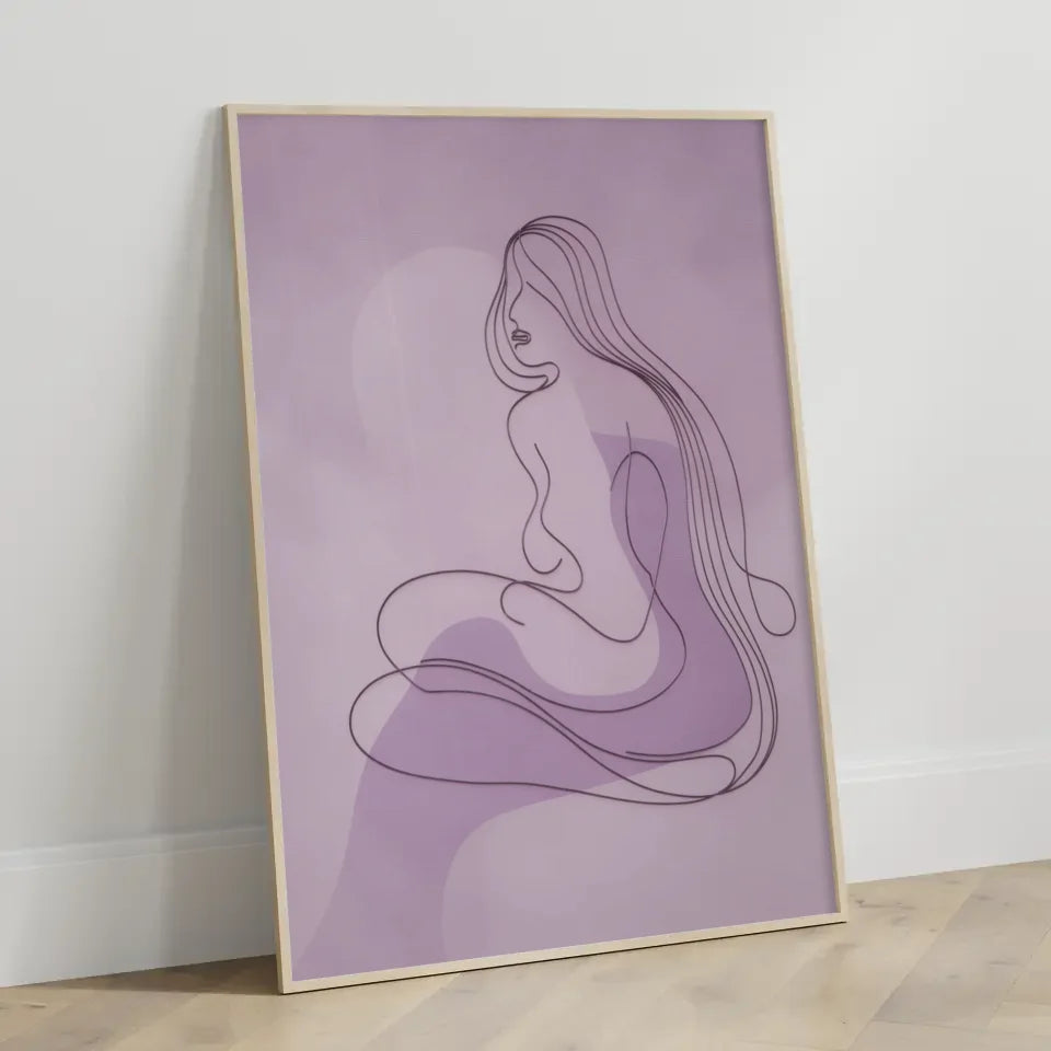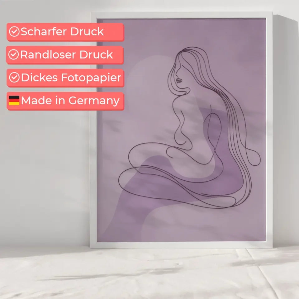 Entdecken Sie unser einzigartiges, abstraktes Poster sitzende Frau in Lila Tönen, das perfekt in jede moderne Wohnung passt. Dieses minimalistische Kunstwerk verbindet Ă€sthetische Eleganz mit einer ruhigen AtmosphĂ€re und ist die ideale Wanddekoration fĂŒr Liebhaber zeitgenössischer Kunst. Die sanften Lilatöne des Posters sorgen fĂŒr eine harmonische Ausstrahlung und verleihen Ihrem Raum eine beruhigende Note. Die flieĂenden Linien, die die Silhouette der sitzenden Frau darstellen, strahlen Ruhe und Gelassenheit aus, wĂ€hrend die angedeuteten GesichtszĂŒge eine nachdenkliche Stimmung erzeugen.