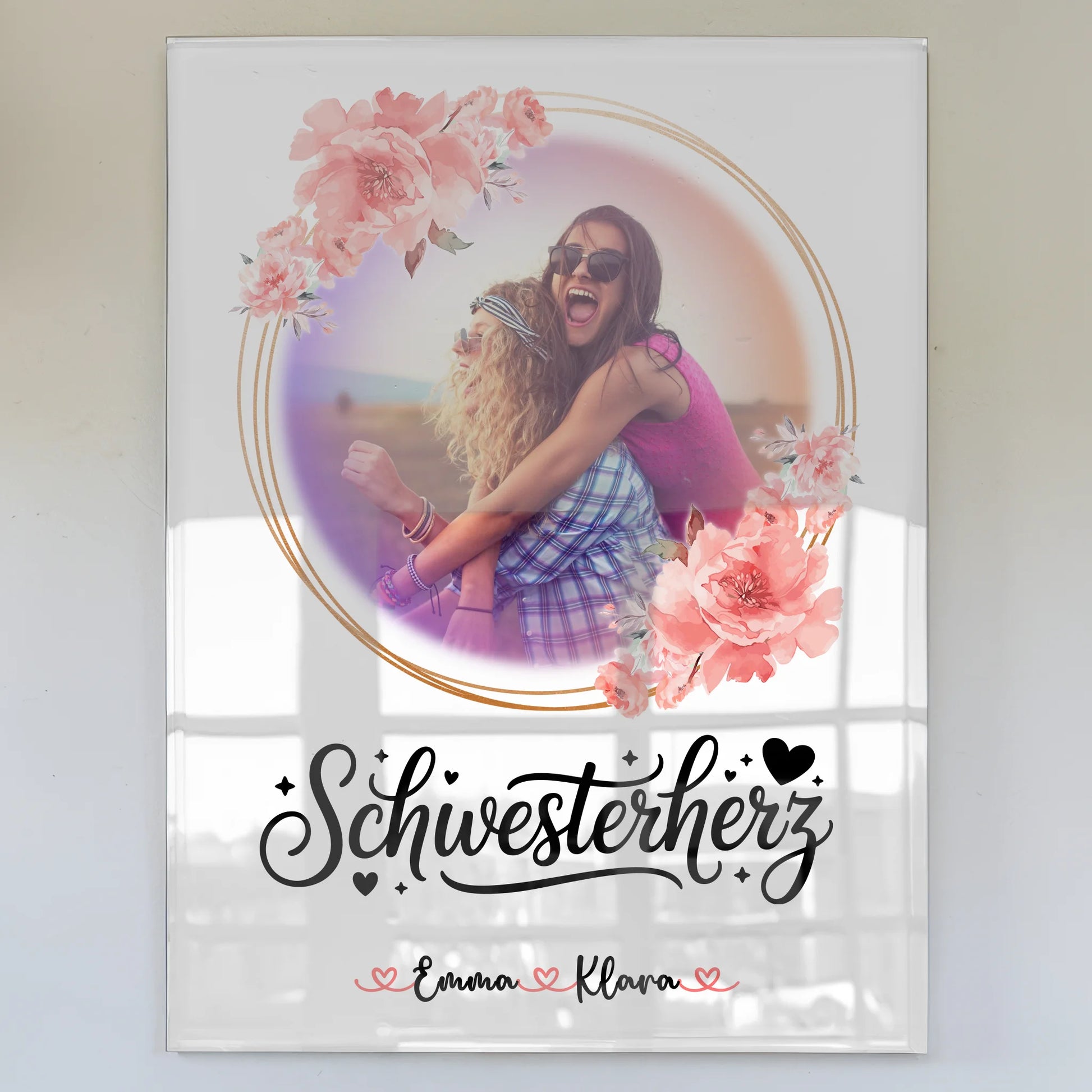 Gestalte ein persönliches Acryl Bild für deine Schwester zum Geburtstag mit 1 Foto, individuellem Hintergrund, Namen und eigenem Wunschtext. Das Design kombiniert moderne Acrylglasoptik mit liebevollen Details und sorgt für ein emotionales Geschenk, das lange erinnert.
