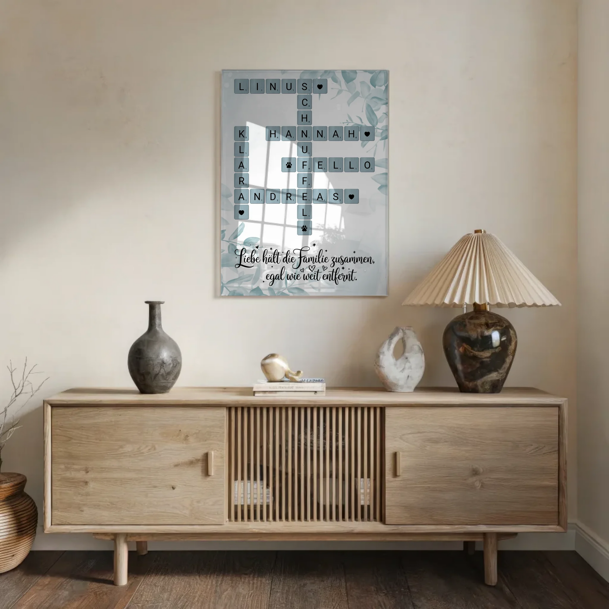 Lass deiner Kreativität freien Lauf und gestalte ein einzigartiges Kunstwerk, das deine Familie widerspiegelt. Mit dem Kreuzworträtsel im Scrabble Style mit Namen, wird dein persönliches Familienbild zu einem unvergesslichen Highlight. Bestelle jetzt dein individuelles Acrylglas Bild Familie personalisiert und überrasche deine Liebsten mit einem Geschenk voller Liebe und Individualität!