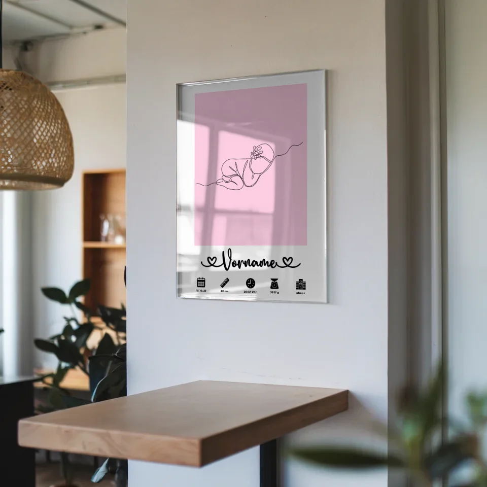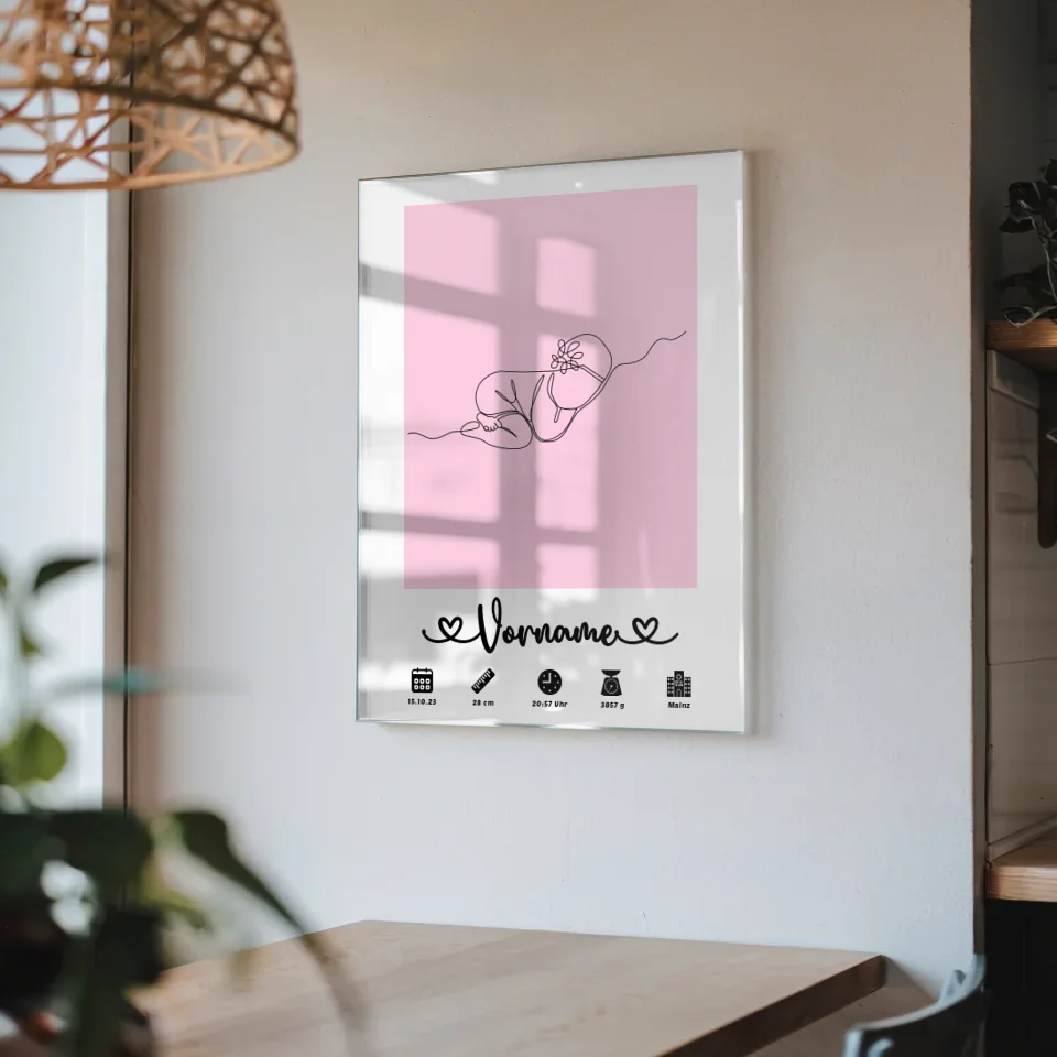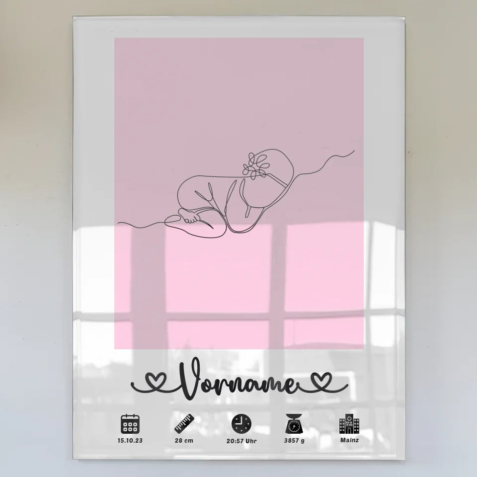 Gestalte jetzt dein individuelles Acrylglas Bild Geburt Baby Schläft Lineart Hellrosa personalisiert und mache jeden Anlass unvergesslich!