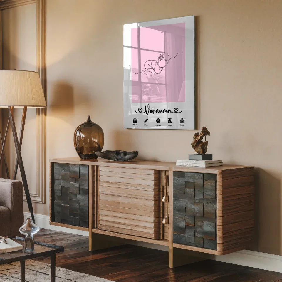 Entdecke das einzigartige Acrylglas Bild Geburt Baby Schläft Lineart Hellrosa personalisiert für das Kinderzimmer