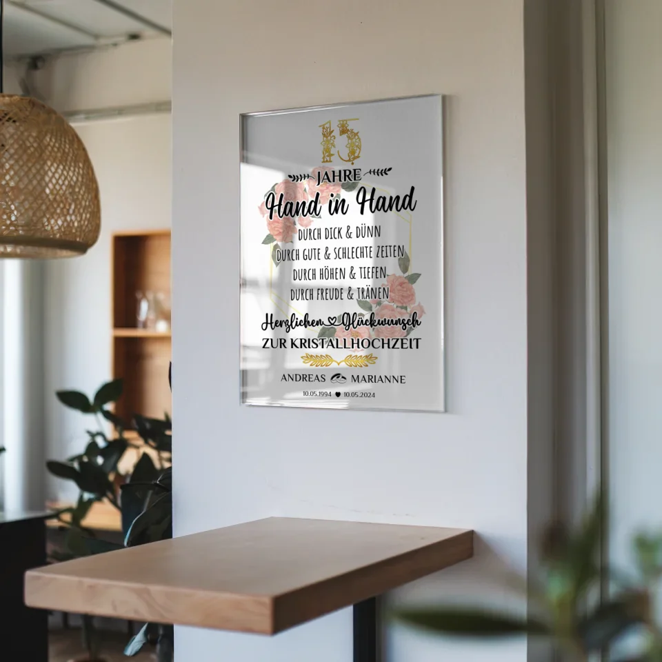 Feiere den besonderen Moment der Liebe mit unserem exklusiven Acrylglas Bild Geschenk zum 15. Hochzeitstag zur Kristallhochzeit. Dieses personalisierte Geschenk ist nicht nur ein wunderschöner Blickfang, sondern auch eine einzigartige Erinnerung an eure gemeinsame Zeit. Du hast die Möglichkeit, das Acrylglas Bild mit euren Namen, dem Datum und dem Hochzeitsjahr zu personalisieren, sodass es eine ganz persönliche Note erhält. Ideal geeignet als Liebevolle Geste für einen wundervollen Hochzeitstag, symbolisiert dieses Geschenk das Motto 'Hand in Hand'. Überrasche deinen Partner oder eure Freunde mit einem besonderen Geschenk, das für immer bleibt. Hol dir jetzt dein Acrylglas Bild, das nicht nur als dekoratives Element dient, sondern auch die bedeutenden Momente eurer Beziehung zelebriert. Mache den 15. Hochzeitstag unvergesslich mit diesem personalisierten Geschenk zur Kristallhochzeit, das eure Liebe in einem stilvollen Design hervorhebt!