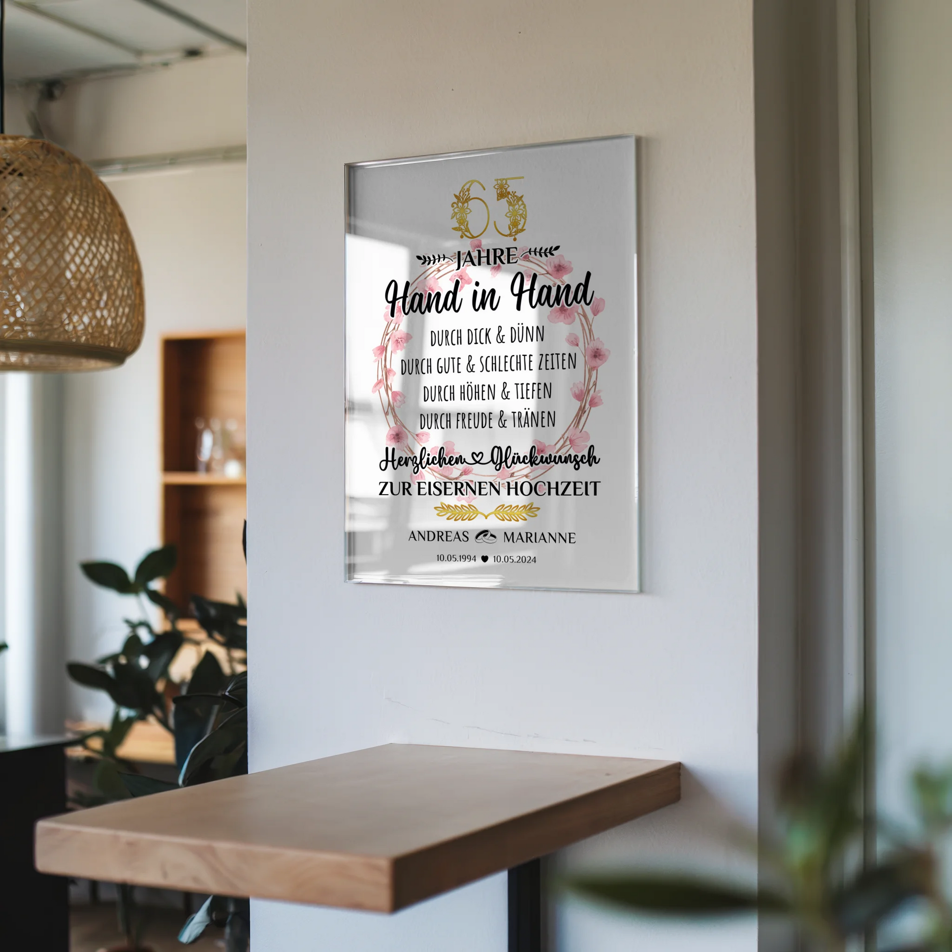 Mach den 65. Hochzeitstag zu einem unvergesslichen Ereignis mit unserem einzigartigen Acrylglas Bild Geschenk 65 Hochzeitstag zur Eiserne Hochzeit. Dieses personalisierte Geschenk ist die perfekte Möglichkeit, die Liebe und das gemeinsame Leben eines Paars zu feiern. Du kannst das Acrylglas Bild mit den Namen des Paares, dem Hochzeitstag-Datum und dem Hochzeitsjahr individuell gestalten und so ein ganz persönliches Erinnerungsstück schaffen.