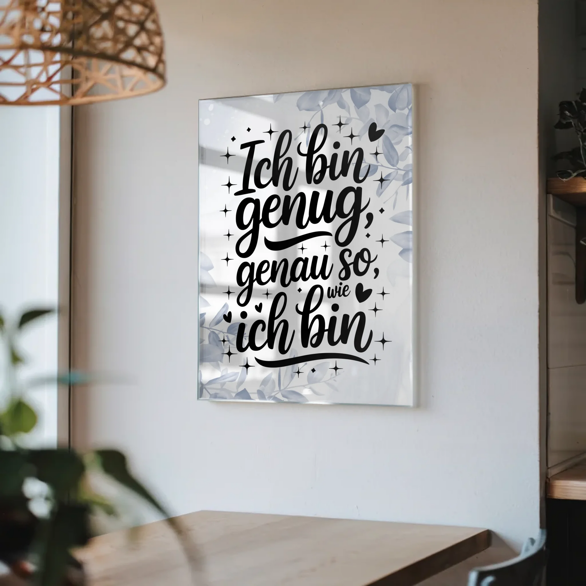 Ob als Geschenkidee für Freunde oder als tägliche Motivation für dich selbst, dieses Acrylglas Bild ist ein Ausdruck von Selbstliebe und Akzeptanz. Lass dich von der Botschaft 'Ich bin genug, genau so, wie ich bin' inspirieren und stärke dein Selbstbewusstsein mit dieser täglichen Affirmation.