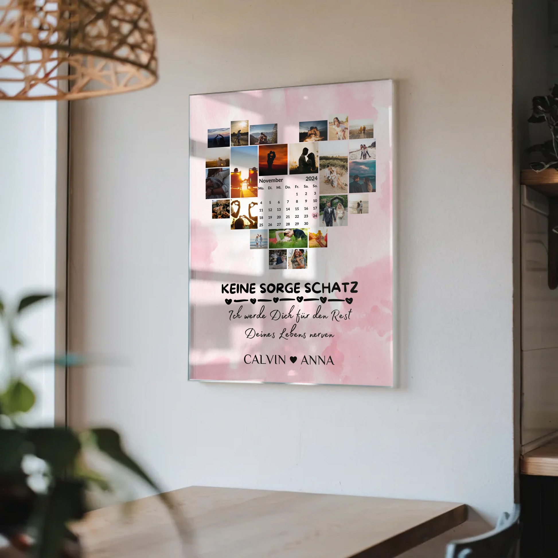 Dieses personalisierte Magnet Poster Fotoboard ist nicht nur ein Hingucker, sondern auch eine liebevolle Erinnerung an eure gemeinsame Zeit. Der charmante Spruch 'Keine Sorge Schatz Ich Werde Dich Ewig Nerven' verleiht dem Design eine humorvolle Note und zeigt deinem Partner, wie sehr du ihn liebst.