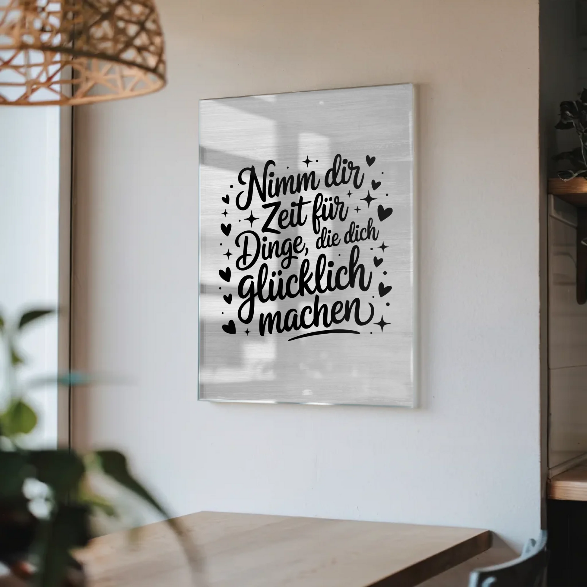 Ob als Geschenkidee für Freunde oder als persönlicher Motivationsschub – dieses Acrylglas Bild bringt Freude und Inspiration in jeden Raum. Der Spruch 'Nimm dir Zeit für Dinge, die dich glücklich machen' ist eine kraftvolle Erinnerung daran, sich auf das Positive zu konzentrieren und täglich Affirmationen in dein Leben zu integrieren.