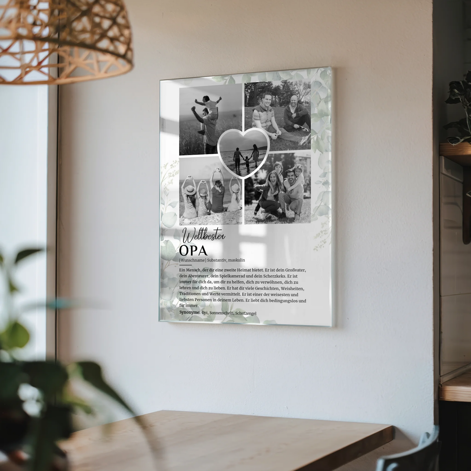 Mit dem Acrylglas Bild kannst Du gleich 5 Fotos Deiner Wahl einfügen, sowie den Namen Deines Opas und ein individuell gewähltes Hintergrundbild. Die stilvolle Kombination aus Schwarz Weiß und Eukalyptus sorgt für eine edle und moderne Optik, die in jedem Wohnzimmer zum Blickfang wird. Dieses personalisierte Geschenk zeigt, wie wertvoll Deine Erinnerungen sind und hält sie für die Ewigkeit fest.