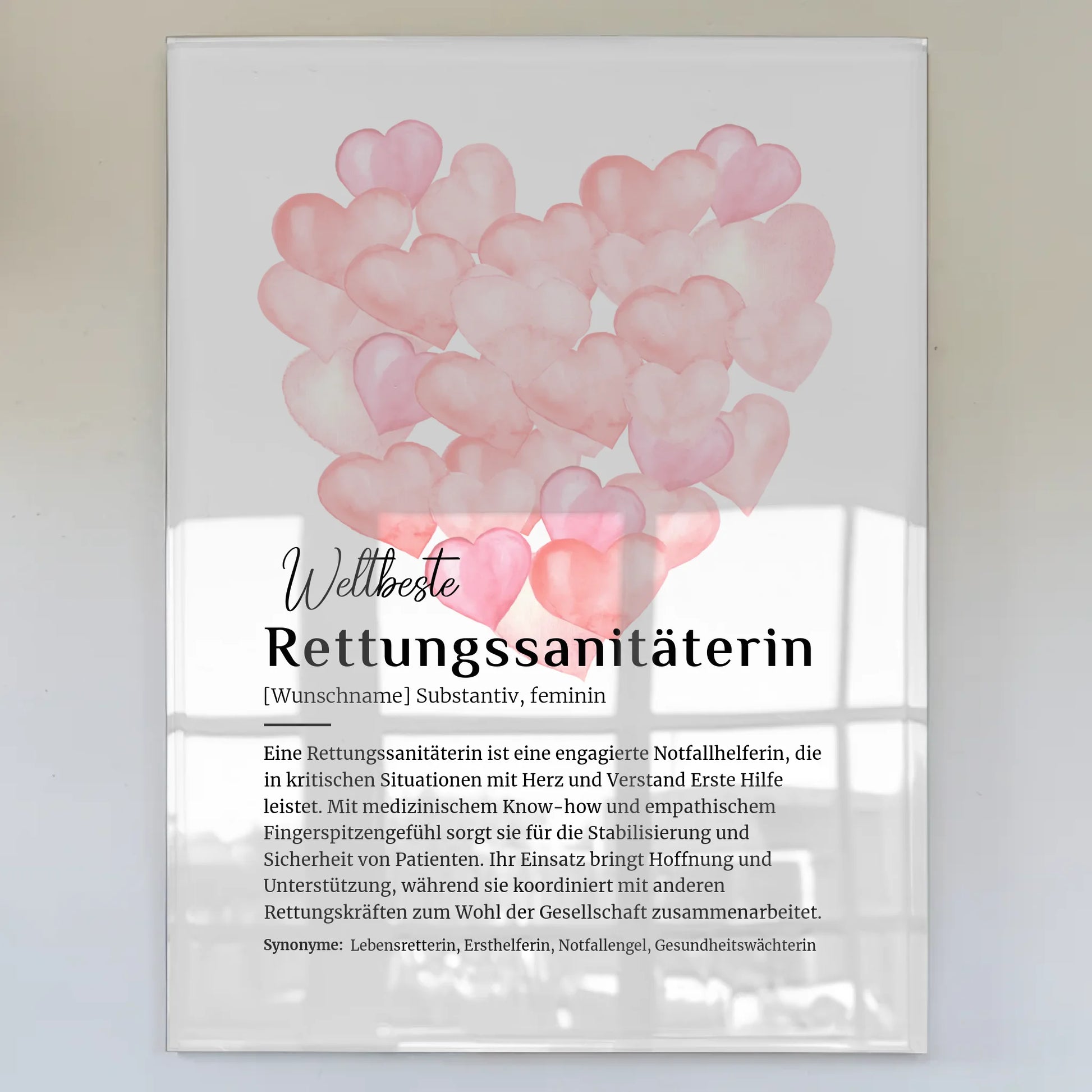 Das Acrylglas Bild Poster Definition kombiniert modernes Design mit emotionaler Bedeutung und macht es zum idealen Mitbringsel für jeden Anlass. Lass Deine Kreativität spielen und wähle das passende Hintergrundbild aus, um die Wertschätzung für die Tätigkeit als Rettungssanitäterin noch mehr zu unterstreichen. Dieses personalisierte Geschenk wird sicherlich für Freude sorgen und in Erinnerung bleiben.