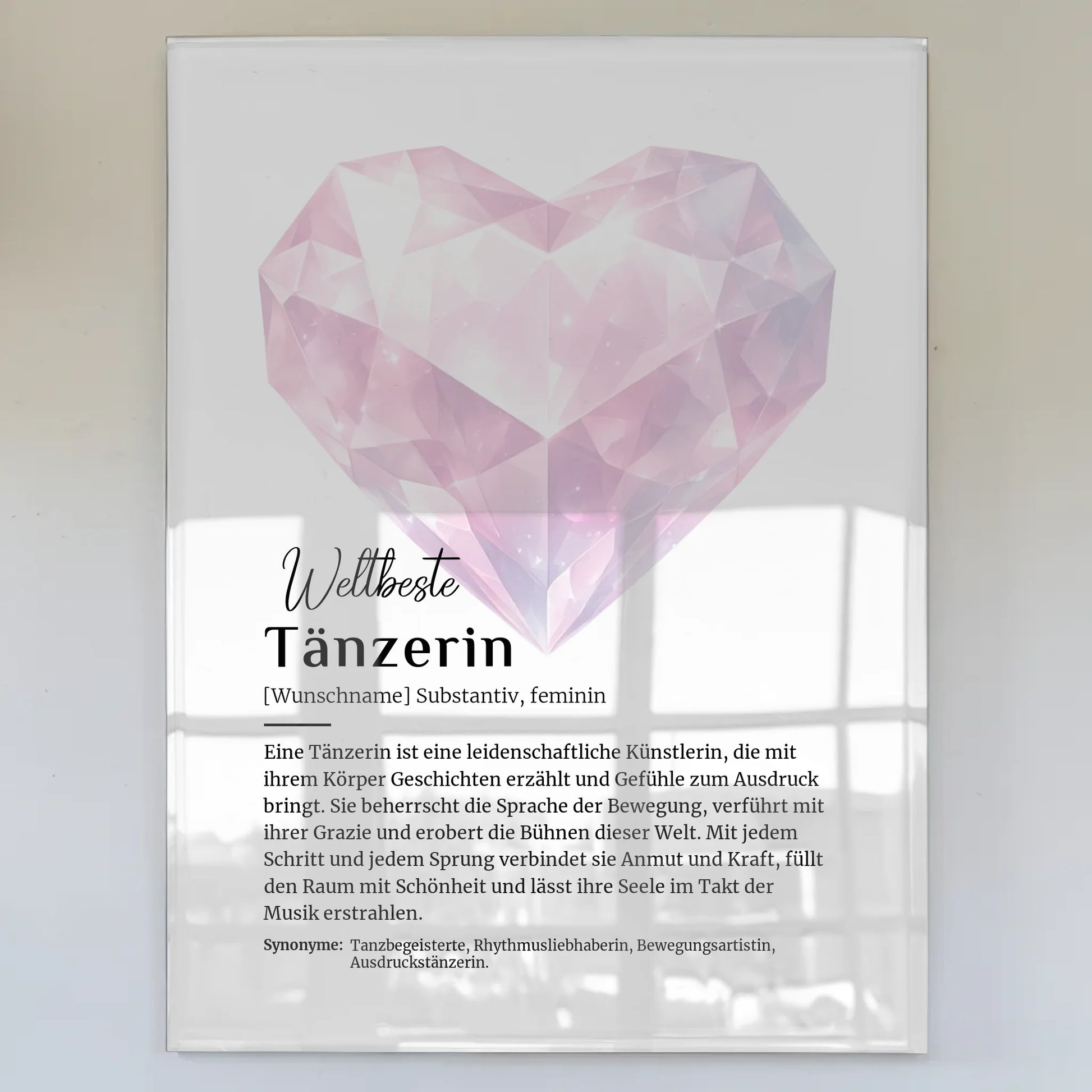 Mit diesem Acrylglas Bild hast du die Möglichkeit, deine KreativitĂ€t auszuleben. WĂ€hle aus verschiedenen Hintergrundbildern und fĂŒge den Namen deiner Wahl hinzu. Das sorgt fĂŒr ein ganz persönliches Geschenk, das in Erinnerung bleibt. Ob als TĂ€nzerin, die ihre Liebe zum Tanzen zelebriert oder als besondere Motivation â dieses Geschenk spricht alle an!