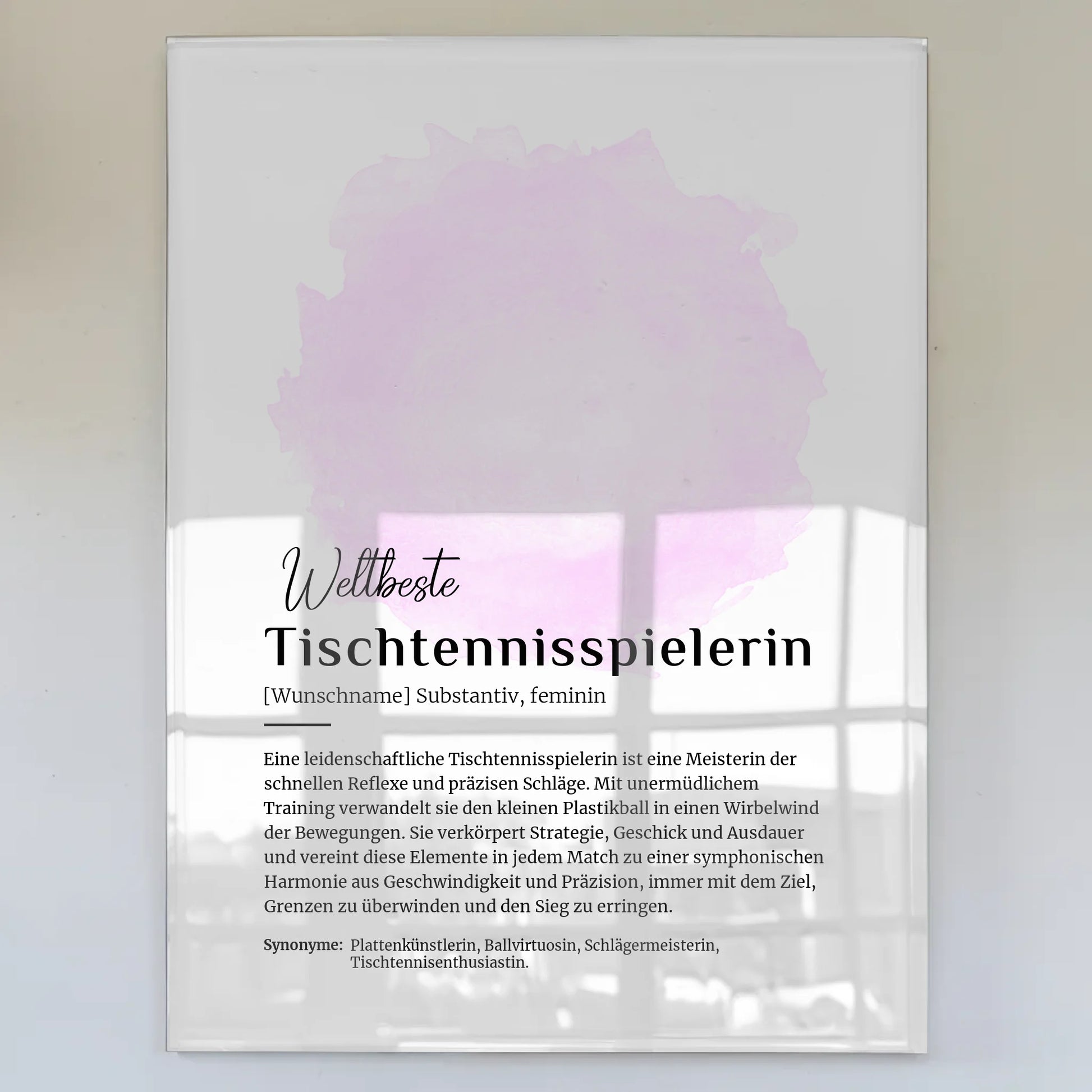 Mit der Möglichkeit, sowohl den Namen als auch das Hintergrundbild zu personalisieren, wird dein Acrylglas Bild Poster zu einem ganz besonderen Kunstwerk. Gestalte deine eigene Geschichte: Setze eine Tischtennisspielerin in Szene oder wähle ein aufregendes Tischtennis-Motiv aus, das der Beschenkte sicher lieben wird!