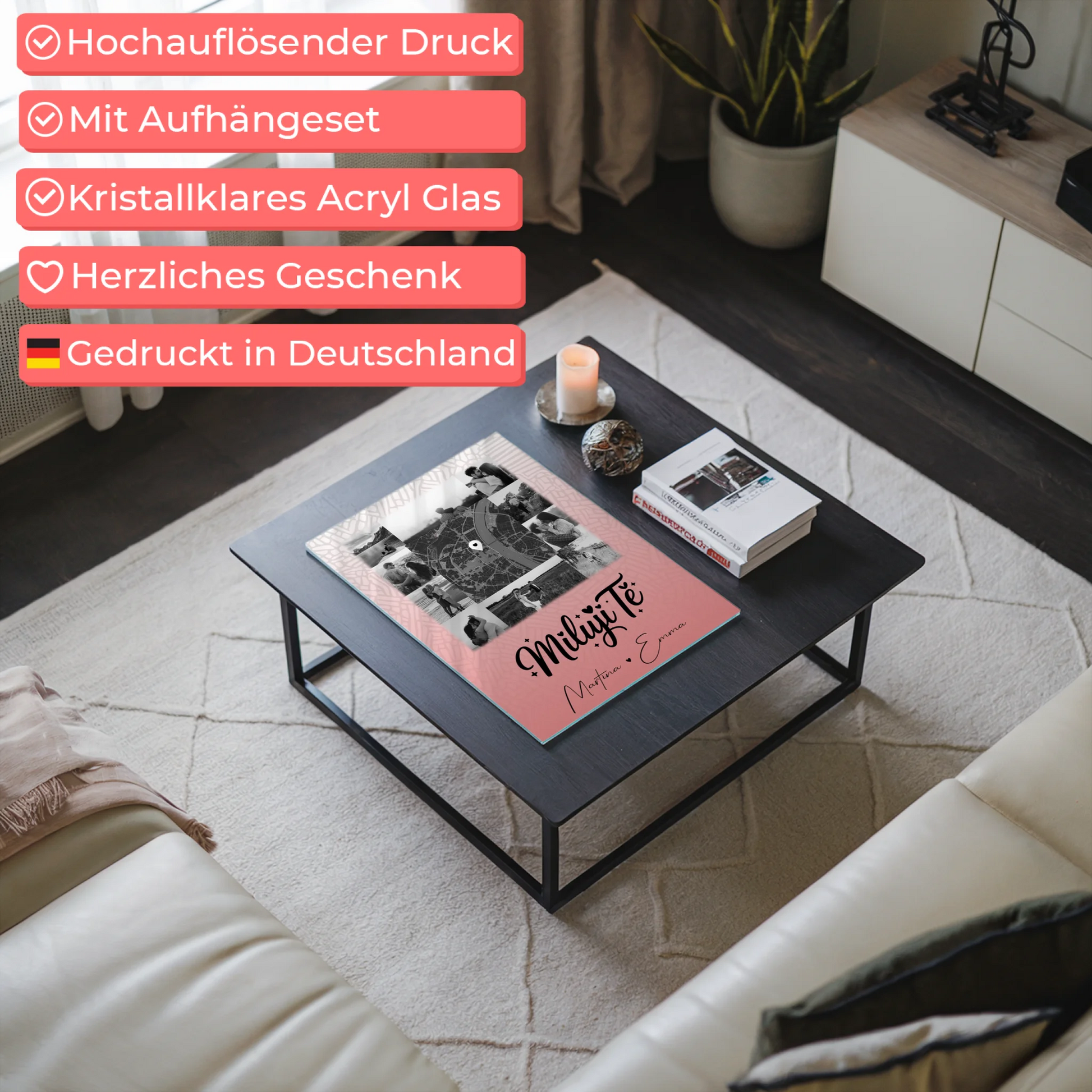 Überrasche deinen Partner oder deine Partnerin mit dem einzigartigen Personalisierte Acrylglas Mit Foto 10 Fotos und Karte in der Mitte Miluji tě Liebe auf Tschechisch. Dieses individuell gestaltete Acrylglas ist ein wunderschöner Blickfang und eignet sich perfekt, um eure gemeinsamen Erinnerungen stilvoll zu präsentieren. Du kannst das Geschenk ganz nach deinen Wünschen personalisieren: Füge bis zu 10 deiner schönsten Fotos hinzu, schreibe einen eigenen Spruch oder Wunschtext, und wähle eine besondere Karte mit einem bedeutungsvollen Ort und Namen. Das Design trägt den liebevollen Spruch Miluji tě – Liebe auf Tschechisch, was dieses Geschenk zu einer besonderen Liebesbekundung macht. Ideal für den Valentinstag, um deine Liebe auf eine einzigartige Weise zu zeigen. Dieses personalisierte Acrylglas ist perfekt für Paare, die ihre gemeinsame Geschichte auf stilvolle und persönliche Weise festhalten möchten. Überrasche deine/n Liebste/n mit einem individuellen Geschenk, das Erinnerungen und Liebe vereint – ein echtes Highlight für jeden Anlass der Liebe.