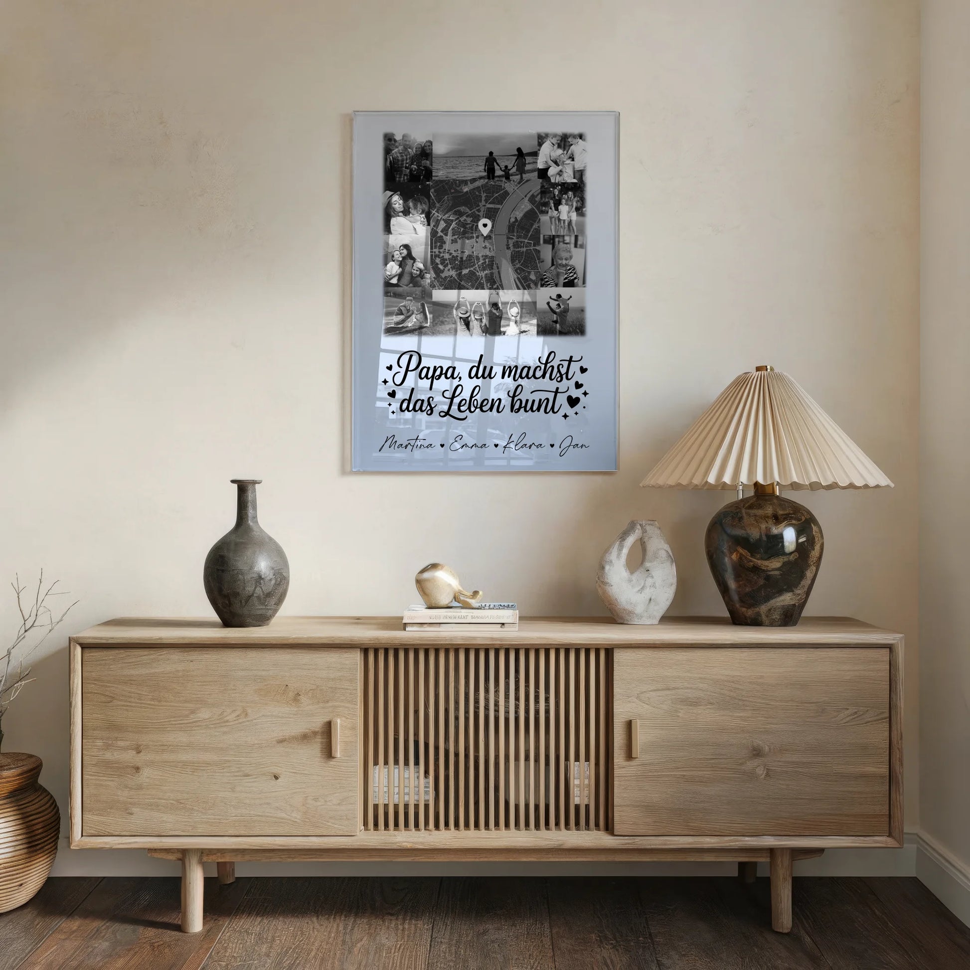Acrylglas Mit Foto 10 Fotos und Karte in der Mitte Papa du bist mein Farbtupfer Schwarz-Weiß