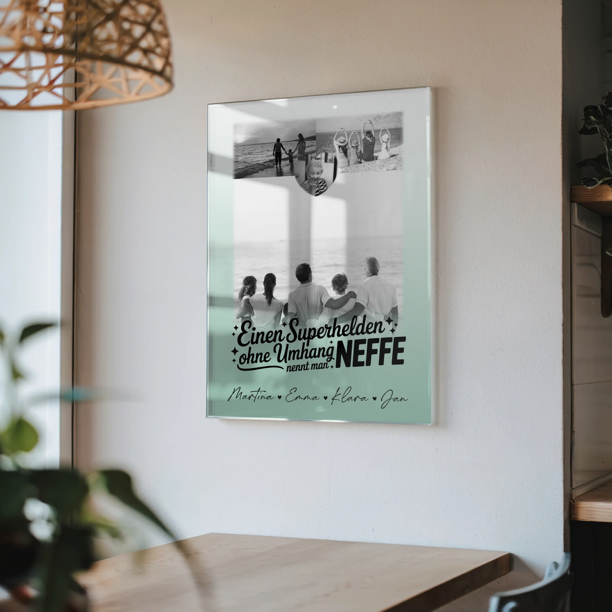 Suchst du nach einem einzigartigen und emotionalen Geschenk für deinen Neffen? Das Produkt Acrylglas Mit Foto 3 Fotos und 1 Herz Foto Bruder ist mein Held Schwarz-Weiß Personalisiertes Geschenk ist die perfekte Wahl, um deine Liebe und Wertschätzung auf besondere Weise auszudrücken. Dieses hochwertige Acrylglas kannst du individuell mit bis zu 4 Fotos, einem eigenen Spruch oder Wunschtext sowie den Namen deines Neffen personalisieren. Das stilvolle Design zeigt den inspirierenden Spruch: Einen Superhelden ohne Umhang nennt man Bruder, was dieses Geschenk zu einem echten Highlight macht. Ob zu Geburtstag, Weihnachten, oder einfach als liebevolle Geste – dieses personalisierte Fotocollage für Neffe ist für jeden Anlass geeignet und bringt garantiert Freude. Überrasche deinen Neffen mit diesem einzigartigen Geschenk, das seine Bedeutung und deine Verbundenheit auf kreative Weise zum Ausdruck bringt. Wähle jetzt dein individuelles Design und mache deinem Neffen eine unvergessliche Freude!