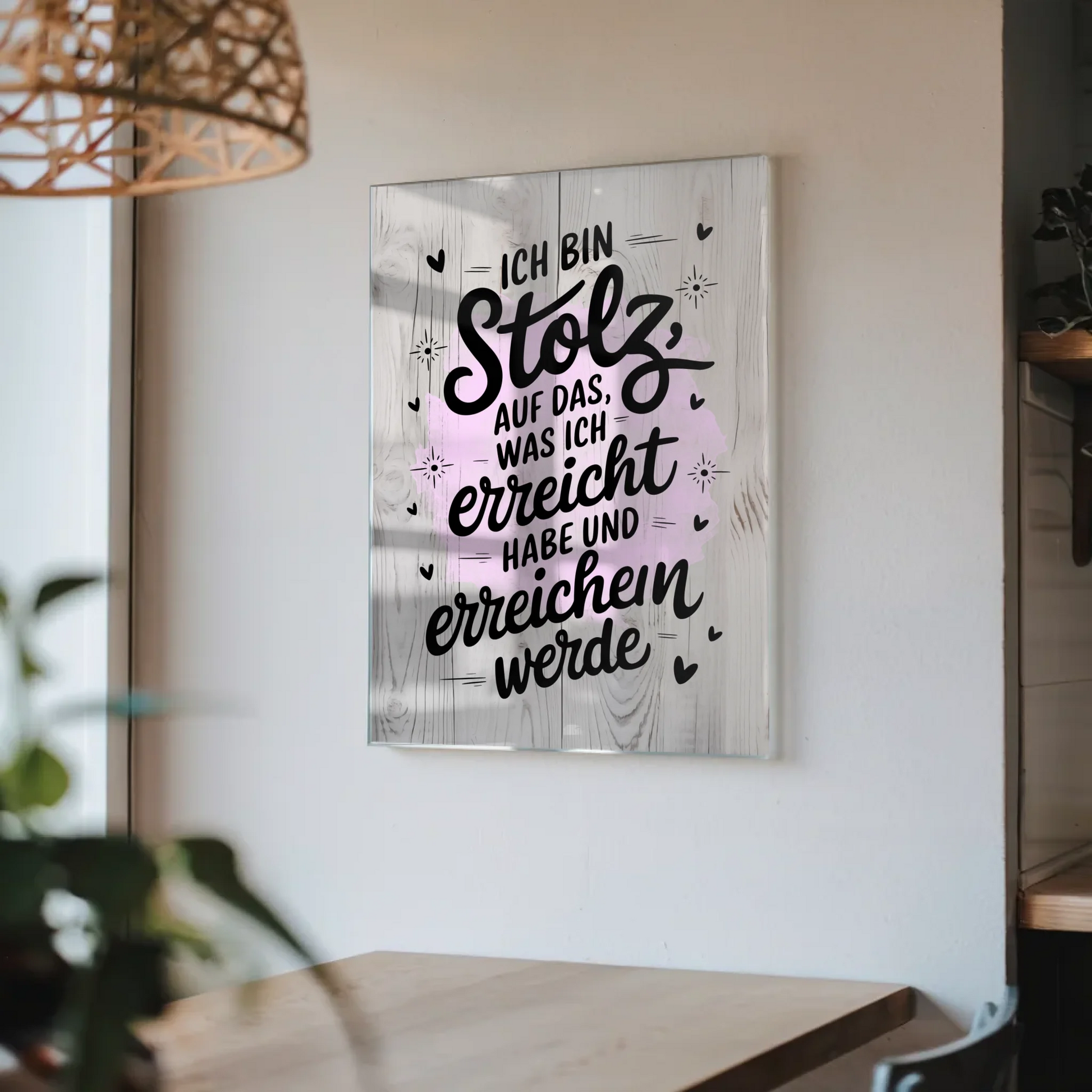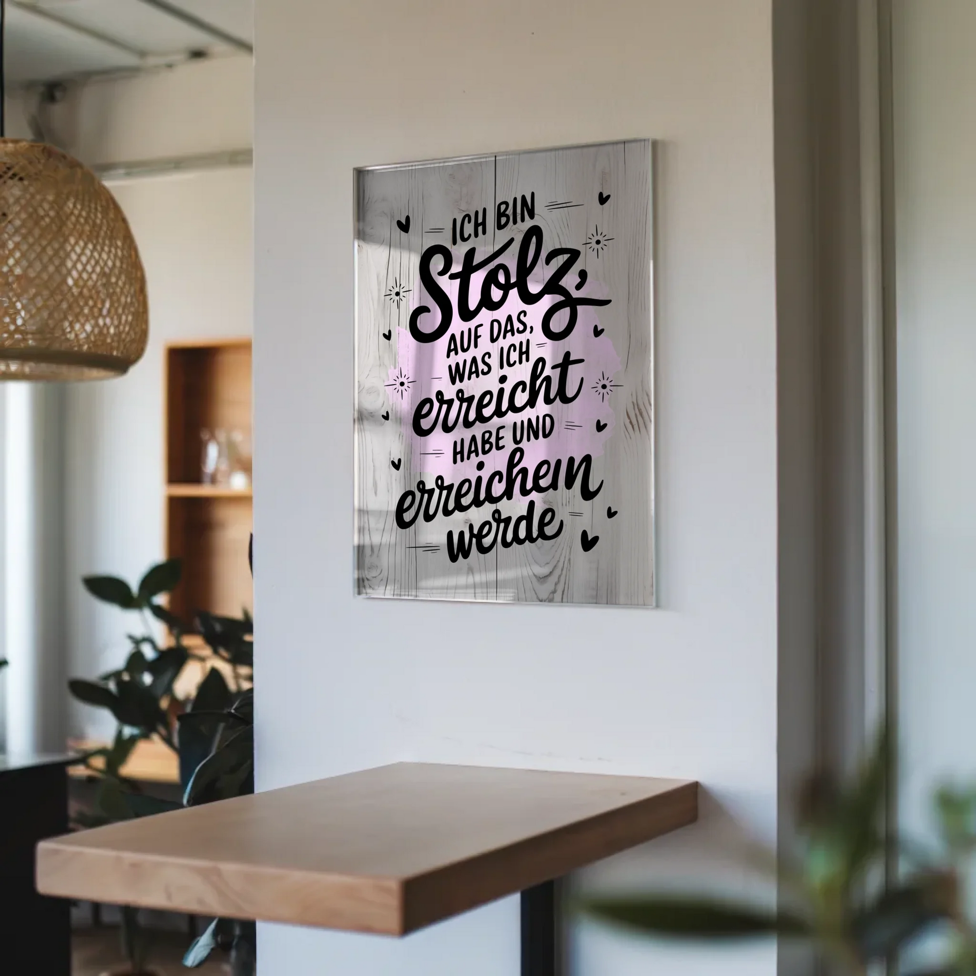 Mit dem schönen Spruch 'Ich bin stolz auf das, was ich erreicht habe und erreichen werde' wird dieses Acrylglas zu einer positiven Affirmation in deinem Alltag. Es erinnert dich daran, wie weit du gekommen bist und motiviert dich für zukünftige Ziele.