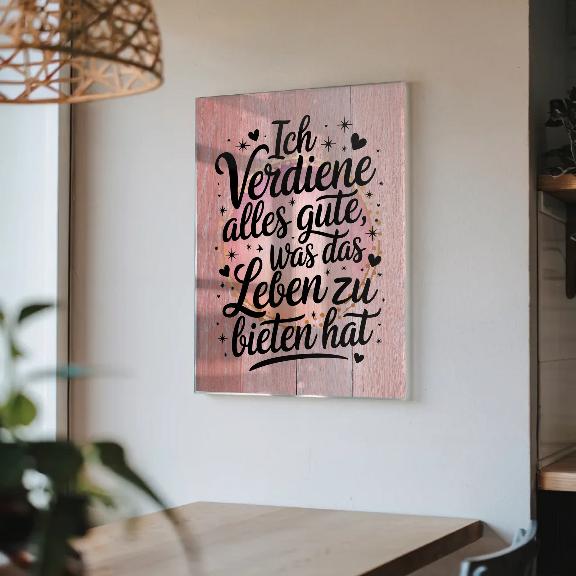 Mit dem inspirierenden Satz 'Ich verdiene alles Gute, was das Leben zu bieten hat' erinnert dich dieses Acrylglas Wandbild täglich daran, dass du es wert bist, all die positiven Dinge im Leben zu empfangen. Diese Geschenkidee eignet sich hervorragend für Freunde und Familie oder als persönliches Motivationsstück in deinem Zuhause.