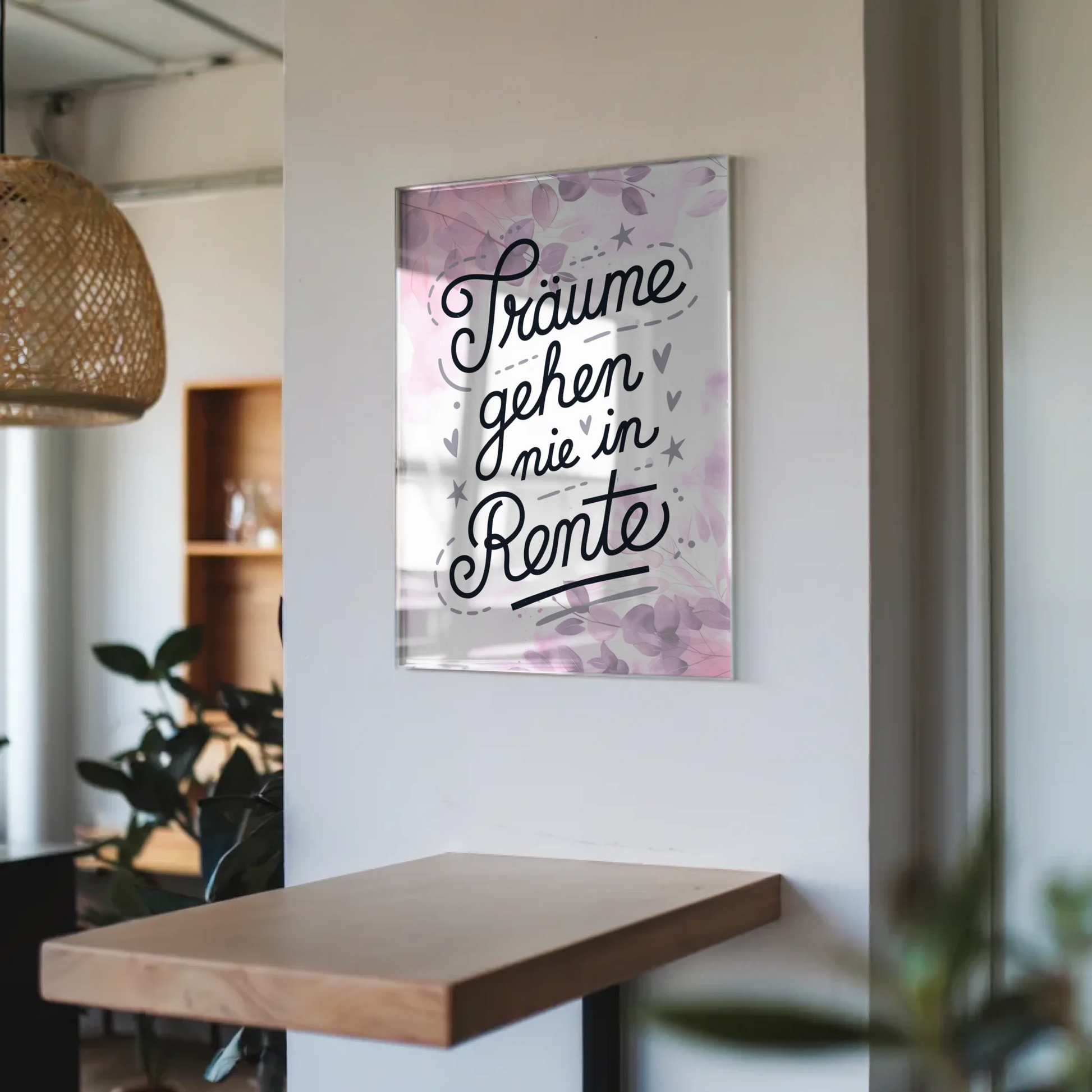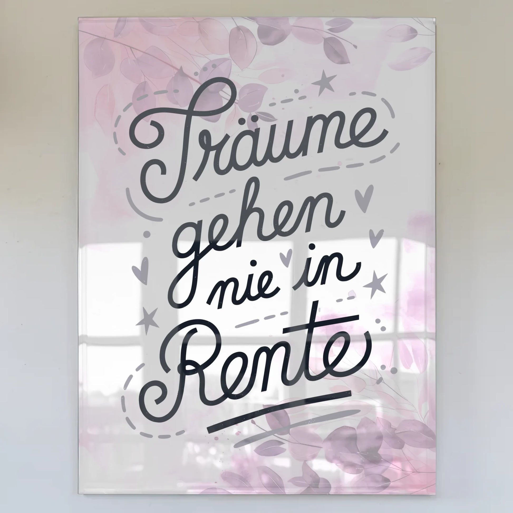 Entdecke das perfekte Acrylglas Wandbild fĂŒr jeden Anlass! Mit dem inspirierenden Spruch 'TrĂ€ume gehen nie in Rente' bringst du positive Energie und Motivation in dein Zuhause. Dieses personalisierbare Geschenk ist ideal, um tĂ€glich Affirmationen zu visualisieren und als schöner Spruch an der Wand zu dienen.