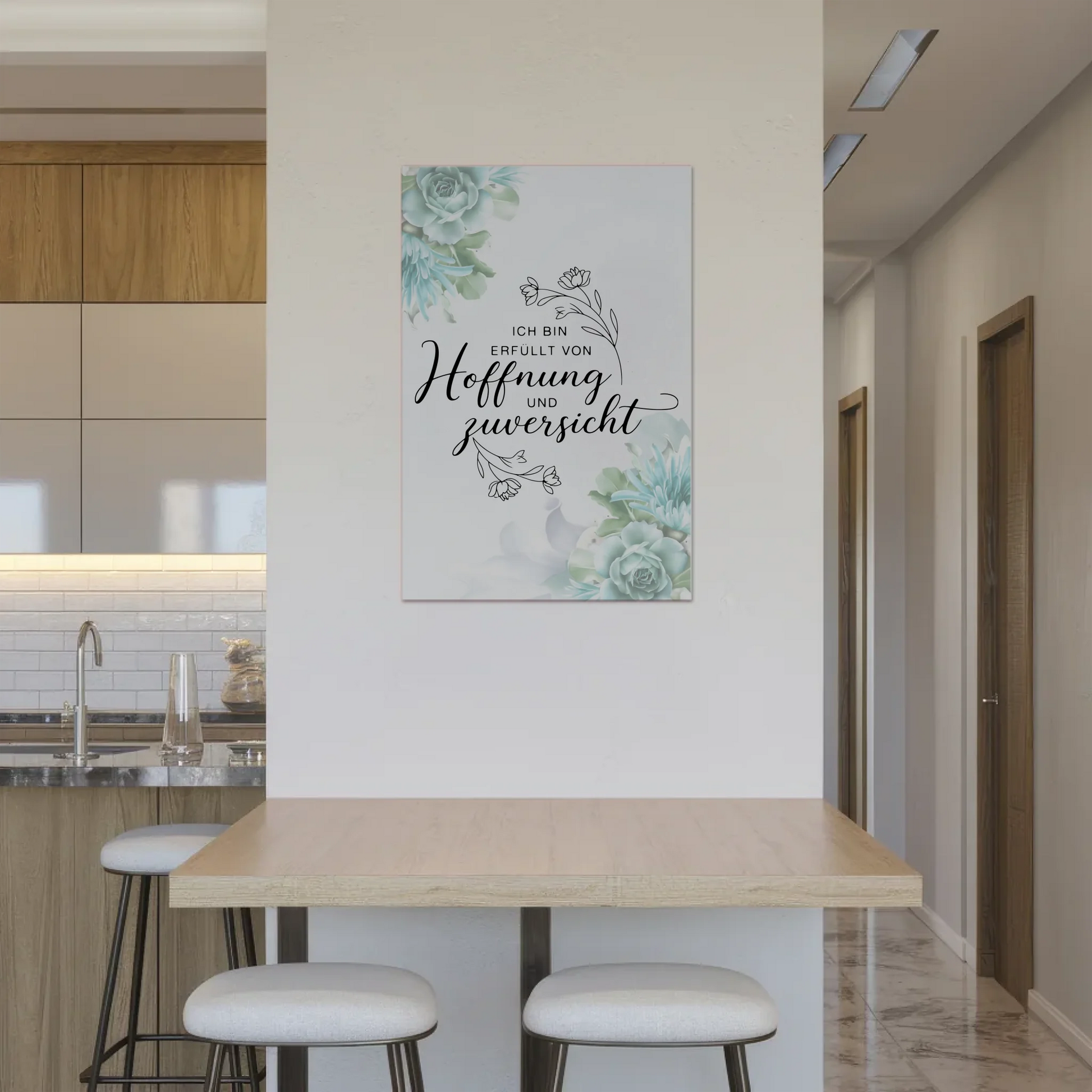 Entdecke das einzigartige Affirmation Magnet Poster, das dir täglich neue Kraft und Motivation schenkt. Mit dem inspirierenden Spruch 'Ich bin erfüllt von Hoffnung und Zuversicht' wird dieses Poster zu einem unverzichtbaren Begleiter in deinem Alltag. Es ist nicht nur ein dekoratives Element, sondern auch eine Quelle der positiven Energie.