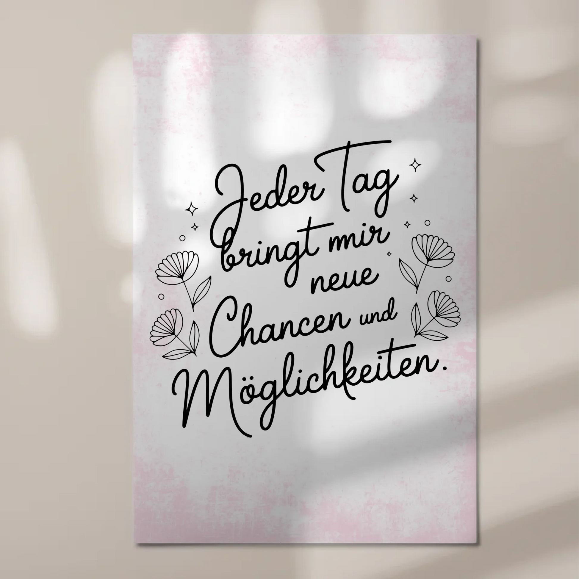 Mit dem Affirmation Magnet Wandbild kannst du deinen Raum in eine Quelle der Inspiration verwandeln. Der schöne Spruch 'Jeder Tag bringt mir neue Chancen und Möglichkeiten' erinnert dich daran, dass jeder Tag voller Potenzial steckt. Egal ob als Geschenkidee für Freunde oder als tägliche Affirmation für dich selbst – dieses Produkt ist vielseitig einsetzbar.