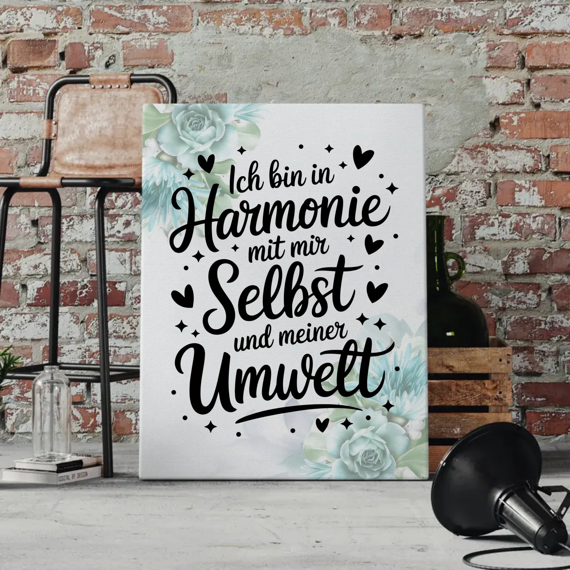 Gestalte deine ganz persönliche AffirmationsLeinwand, indem du das Hintergrundbild auswählst, das am besten zu dir passt. Egal ob modern, floral oder minimalistisch – deine individuelle Note macht diese Leinwand einzigartig. Mit dem schönen Spruch 'Ich bin in Harmonie mit mir selbst und meiner Umwelt' erhöhst du nicht nur deine Motivation, sondern schaffst auch eine Atmosphäre des Wohlbefindens.