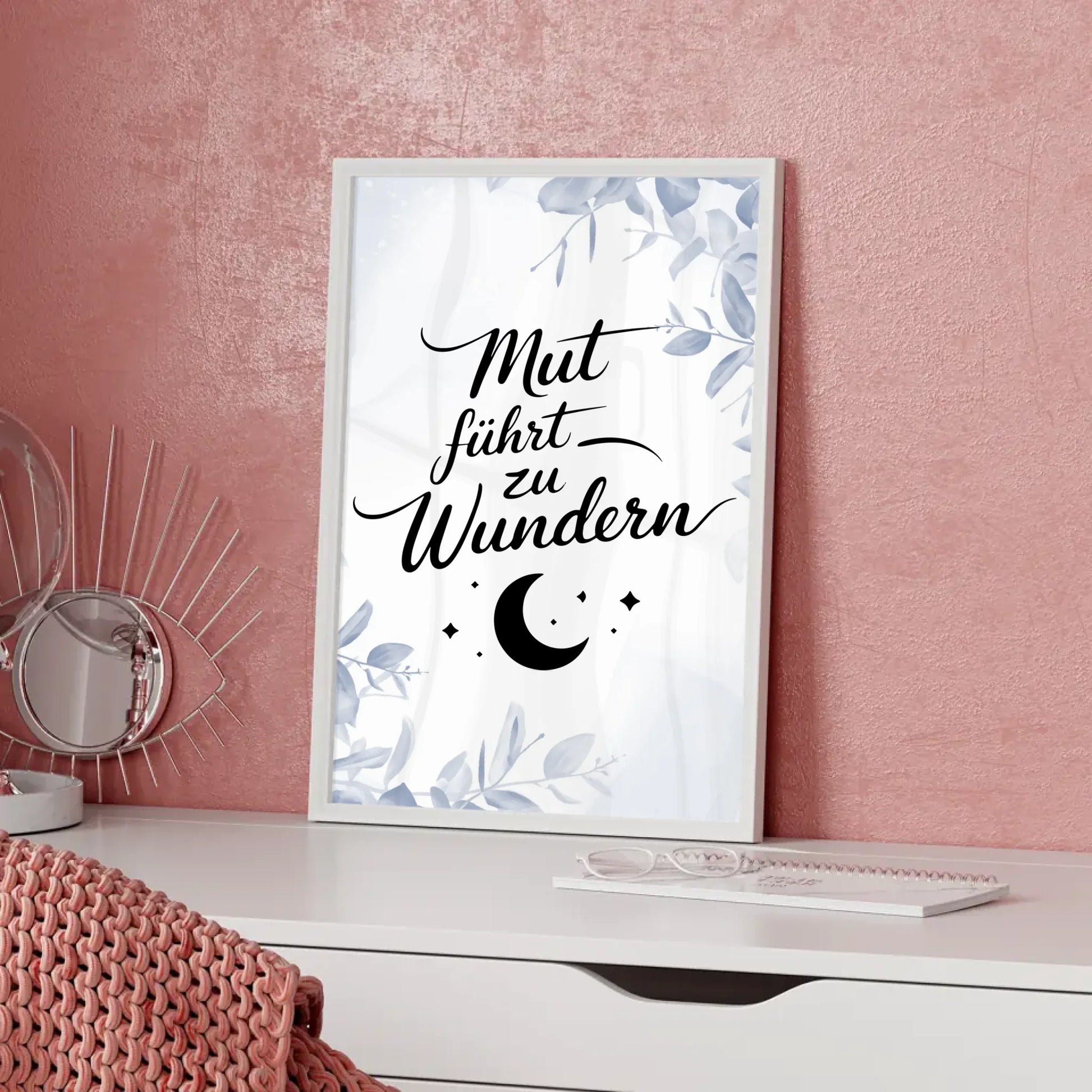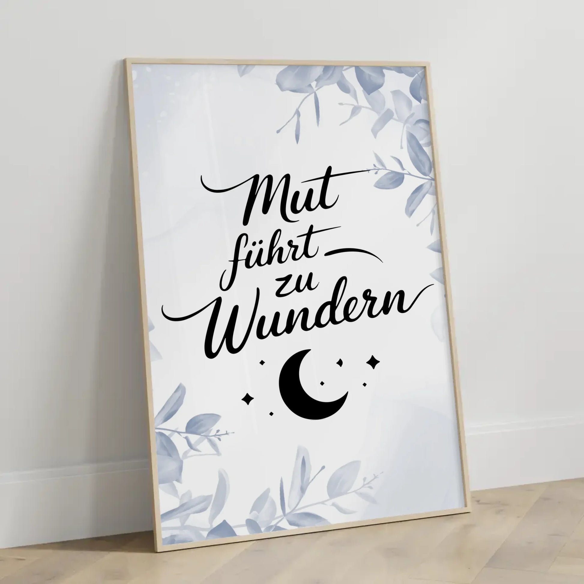 Entdecke unser einzigartiges Affirmations Poster Mut führt zu Wundern, das speziell für dich personalisiert werden kann! Dieses inspirierende Affirmationsposter bietet dir die Möglichkeit, dein persönliches Hintergrundbild auszuwählen, damit es perfekt zu deinem Stil und deiner Einrichtung passt. Die kraftvollen Botschaften motivieren dich täglich und helfen dir, deine Ziele mit positiven Gedanken zu erreichen.