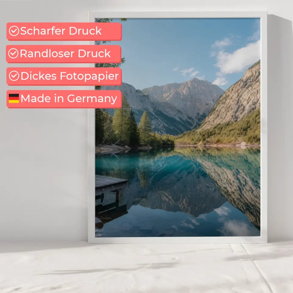 Entdecken Sie unser atemberaubendes Alpine Poster, das eine ruhige alpine Umgebung darstellt. Dieses faszinierende Poster zeigt einen unberührten, klaren See, in dem sich die hoch aufragenden, schroffen Berge im Hintergrund spiegeln. Die natürliche Schönheit dieser Szene bringt eine beruhigende Atmosphäre in Ihr Zuhause. Am Ufer des Sees liegt ein hölzernes Ruderboot, das sanft auf den Wellen schaukelt und von einem idyllischen Holzweg erreichbar ist. Der bedeckte Himmel deutet auf einen kühlen, klaren Tag hin, der ideal für entspannende Momente ist. Mit Schneeflecken auf den Bergen vermittelt das Poster den Eindruck von Höhe und Natur pur. Fügen Sie dieses eindrucksvolle Kunstwerk Ihrer Sammlung hinzu und lassen Sie die ruhige alpine Atmosphäre in Ihre Räume einziehen. Ideal für Wohnbereiche, Büros oder kreative Räume, wird dieses Poster Ihre Wände lebendig machen. Genießen Sie die perfekte Kombination aus Natur und Design mit unserem Alpine Poster und verwandeln Sie Ihr Zuhause in eine Oase der Ruhe.