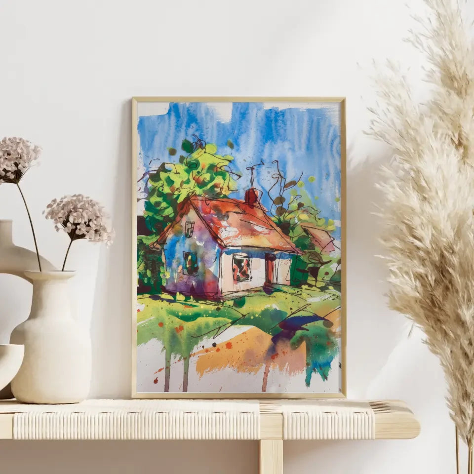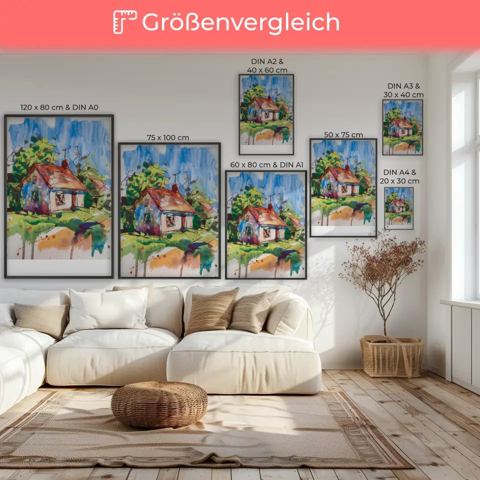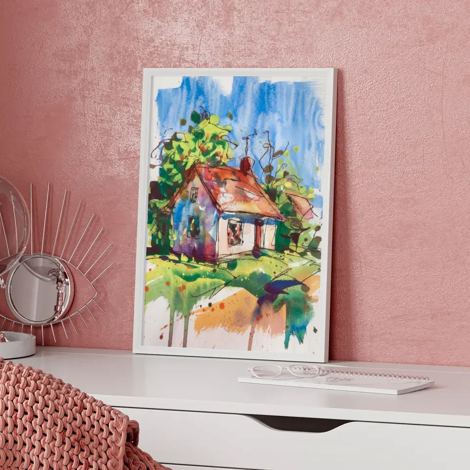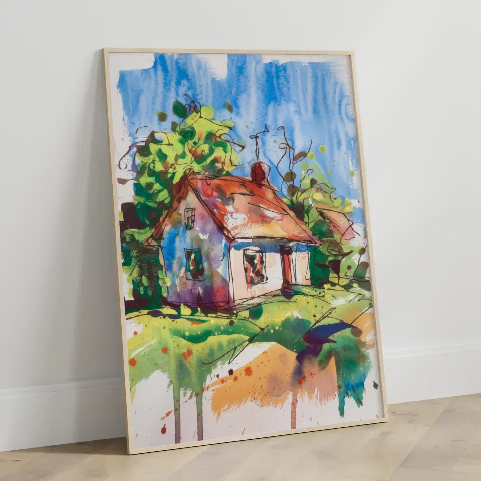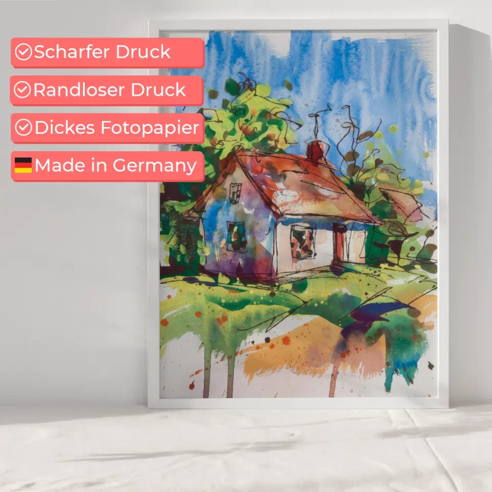 Das Aquarell Poster ist nicht nur ein Blickfang, sondern auch eine Einladung, die Geschichten und Erinnerungen zu erkunden, die sich innerhalb der Mauern des kleinen Hauses abspielen könnten. Es eignet sich perfekt für jeden Raum in Ihrem Zuhause und bringt Naturverbundenheit und künstlerischen Flair in Ihre Einrichtung. Verschönern Sie Ihre Wände mit diesem großartigen Kunstwerk, das sowohl in Wohnräumen als auch in Büros eine harmonische Atmosphäre schafft.