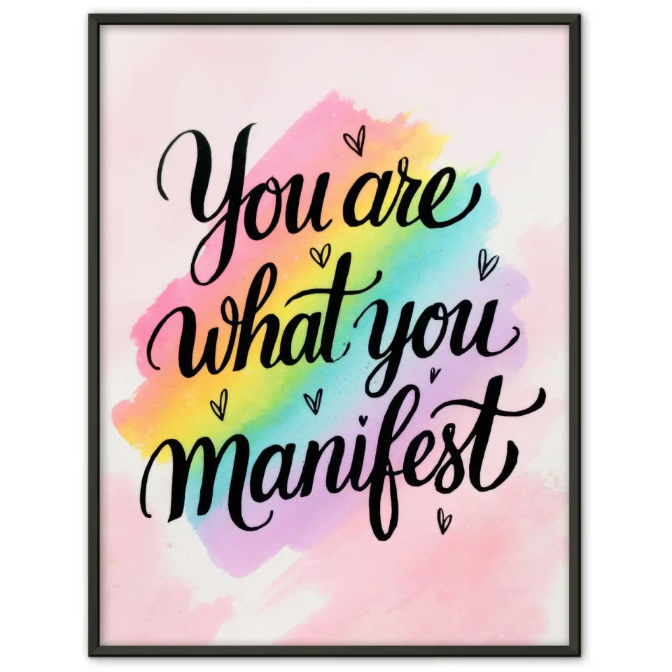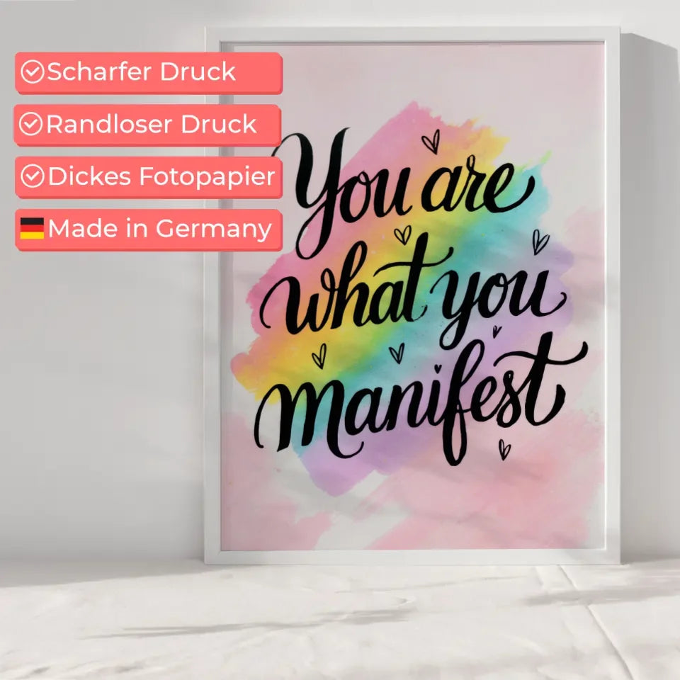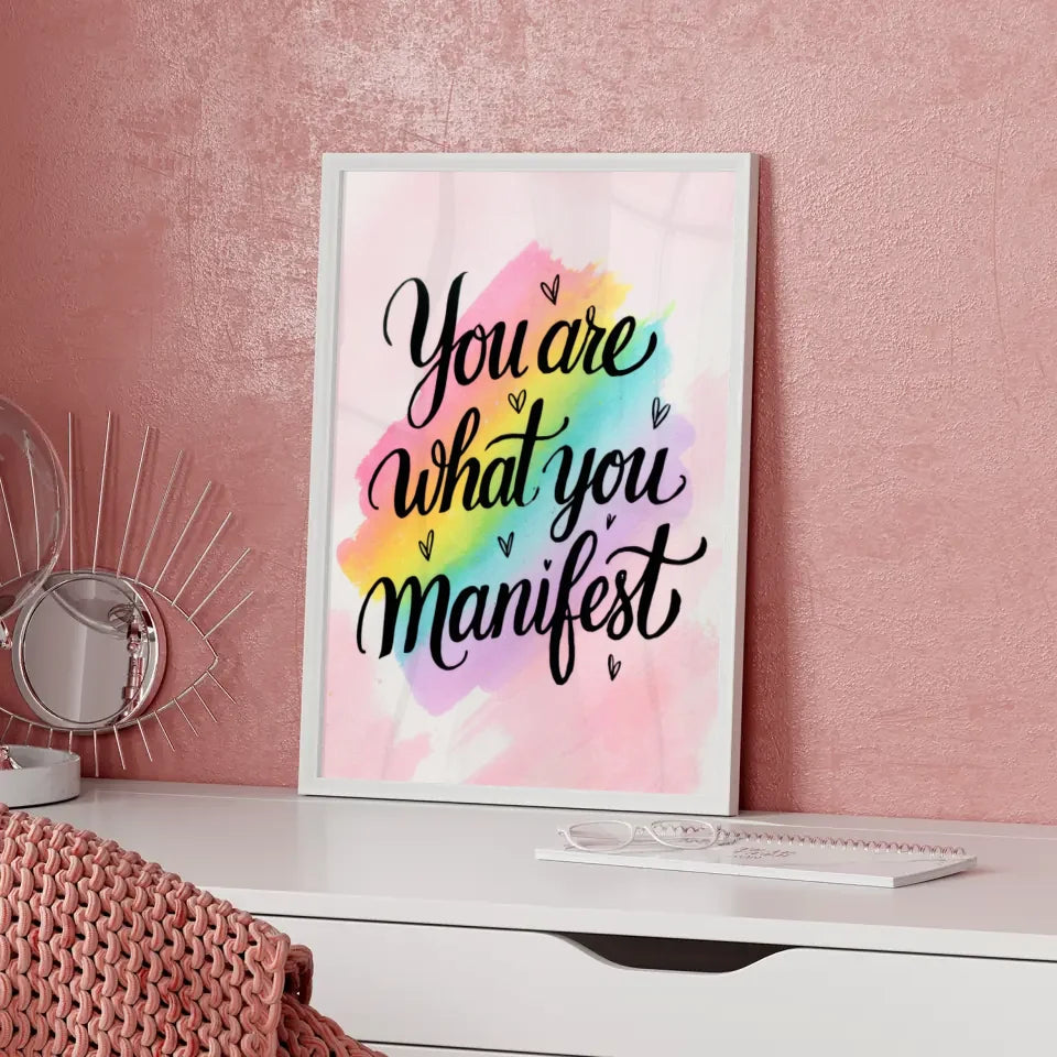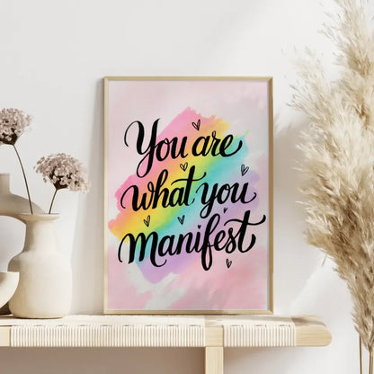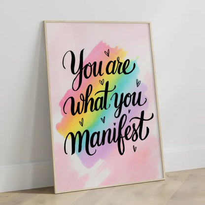 Aquarell Poster mit Zitat: Du bist was du manifestierst in Rosa und Regenbogen