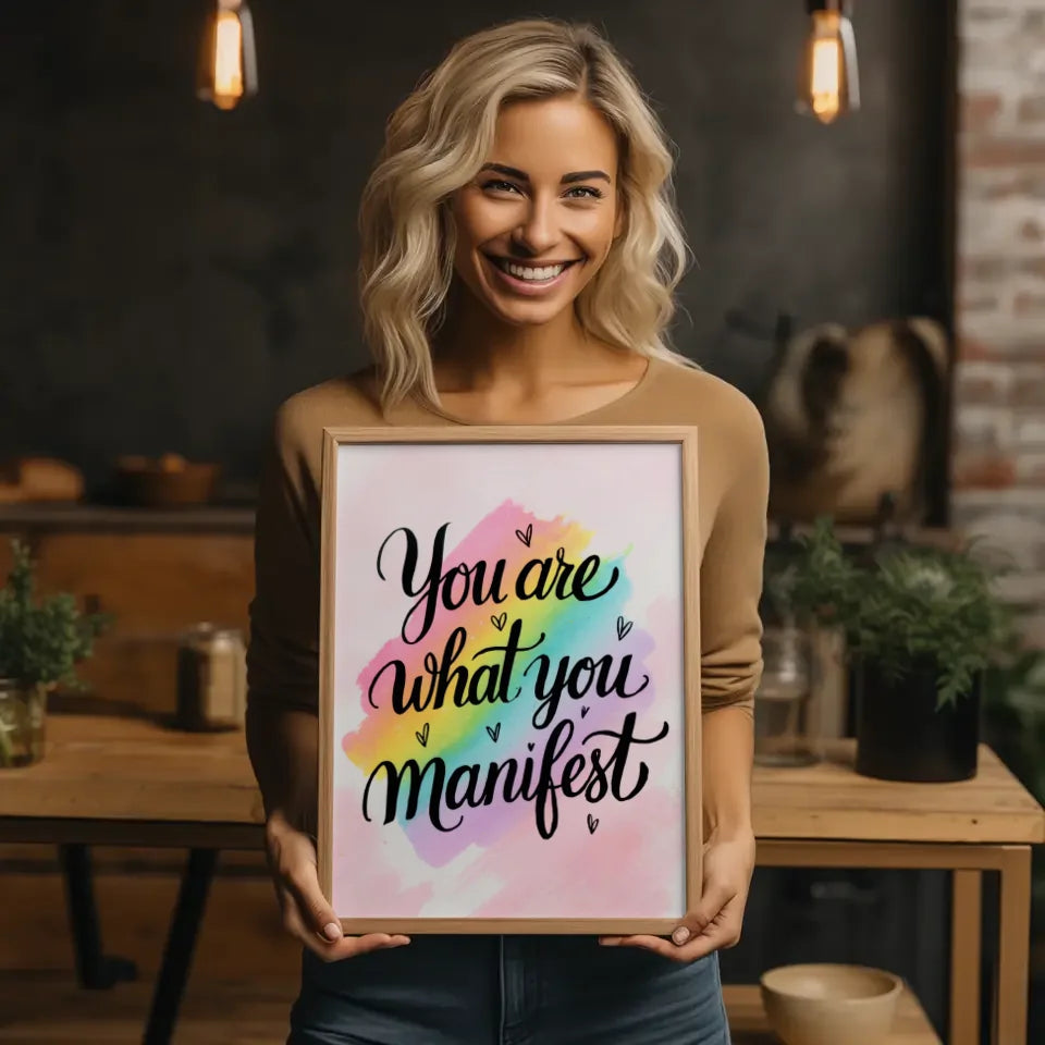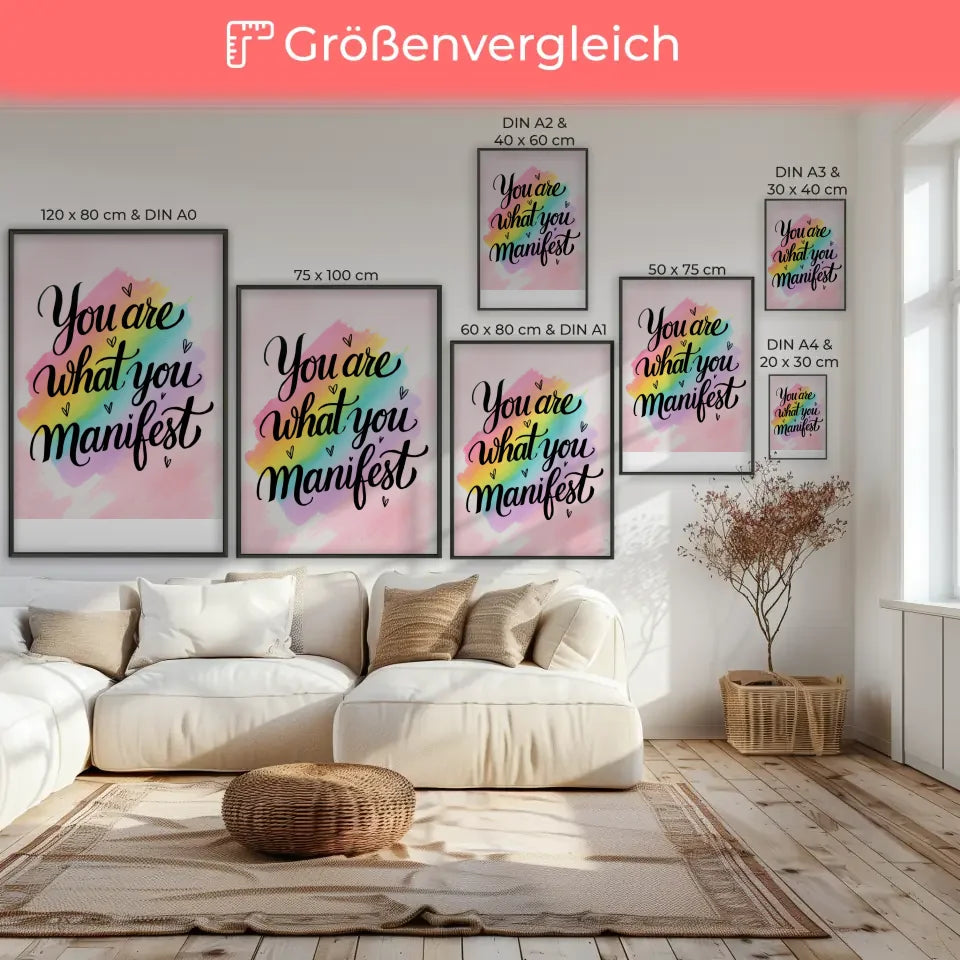 Bringen Sie Farbe und Motivation in Ihr Zuhause mit diesem einzigartigen Aquarell Poster. Ob als individuelles Highlight oder harmonische Ergänzung in Ihrer Wohnung – lassen Sie sich von der kraftvollen Botschaft dieses Spruchbildes leiten und inspirieren. Holen Sie sich jetzt das Aquarell Poster 'Du bist, was du manifestierst“ in Rosa und Regenbogen und verleihen Sie Ihren Wänden einen Hauch von Kreativität und positiver Energie!