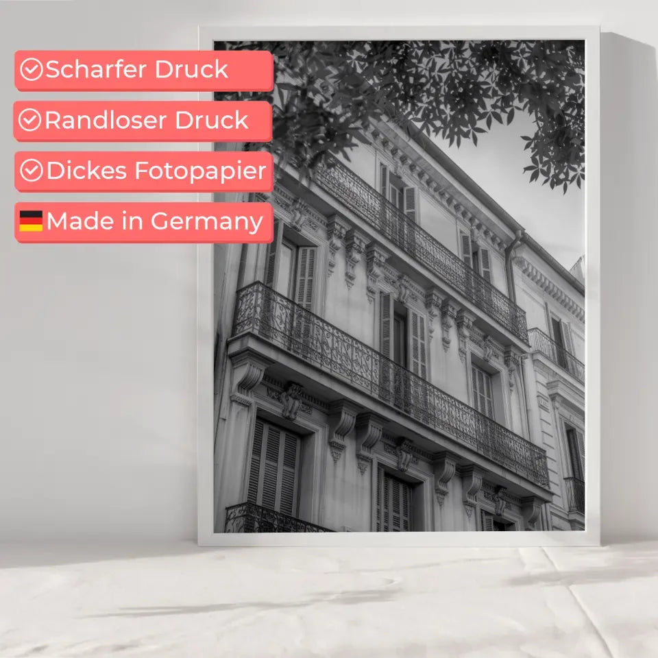 Entdecke das faszinierende Poster 'Architektonische Fassade' in Schwarz-Weiß, das deinem Zuhause einen Hauch von Eleganz verleiht. Dieses beeindruckende Kunstwerk zeigt eine detaillierte Darstellung einer architektonischen Fassade eines prächtigen Gebäudes in einer europäischen Stadt. Das Poster fängt die Schönheit nicht nur der Fassade mit ihren reich verzierten schmiedeeisernen Balkonen und aufwendigen Zierleisten ein, sondern auch die Atmosphäre, die durch das Spiel von Licht und Schatten entsteht.