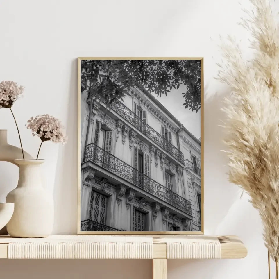 Die zahlreichen Fenster mit Fensterläden erzählen Geschichten von Leben und Geschichte, während die hängenden Blätter eines Baumes darauf hindeuten, dass dieses beeindruckende Poster in einer warmen Jahreszeit aufgenommen wurde. Mit diesem Kunstwerk bringst du nicht nur einen stilvollen Akzent in dein Wohnzimmer oder Büro, sondern auch eine zeitlose Anspielung auf die faszinierende Architektur Europas.