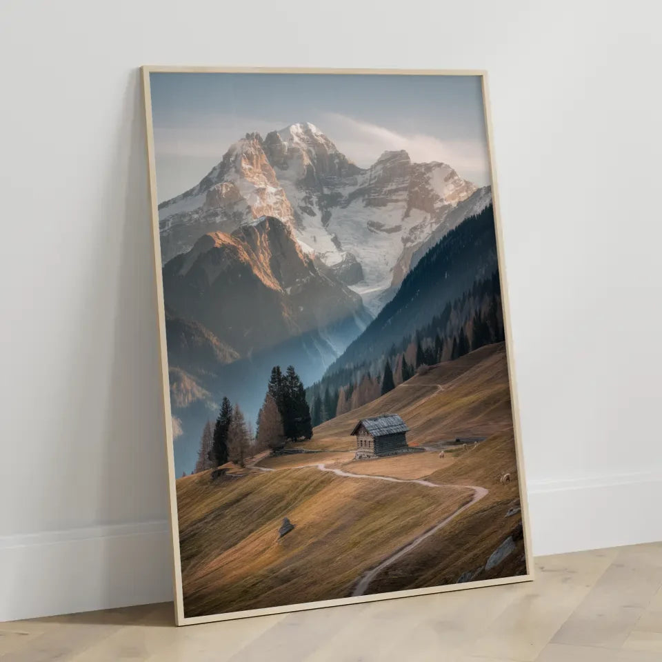 Im Vordergrund des Posters erkennen Sie eine malerische Wiese, bespickt mit verstreuten Bäumen und einer einsamen Holzhütte, die ein Gefühl von Geborgenheit vermittelt. Ein gewundener Weg führt zur Hütte und lädt dazu ein, die umgebende Natur zu erkunden. In der Nähe grasen friedlich einige Tiere, möglicherweise Schafe, was die friedliche Atmosphäre dieses Motivs zusätzlich unterstreicht.