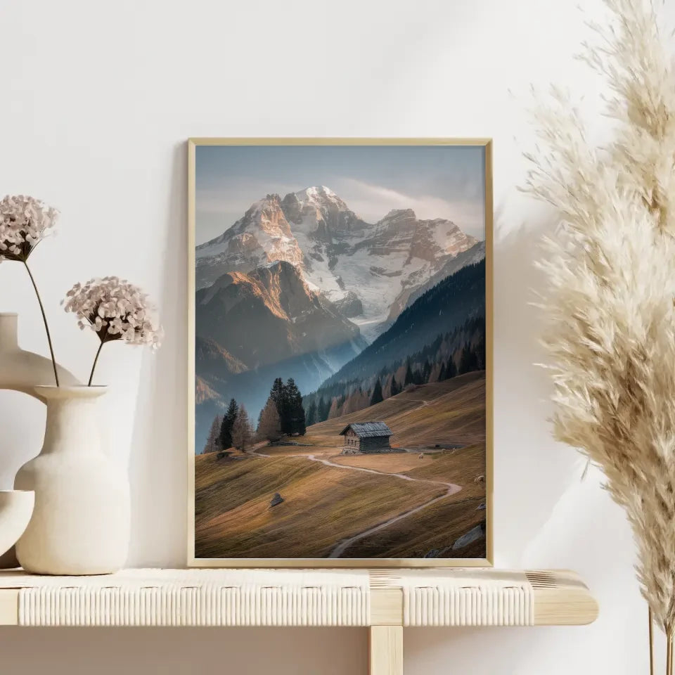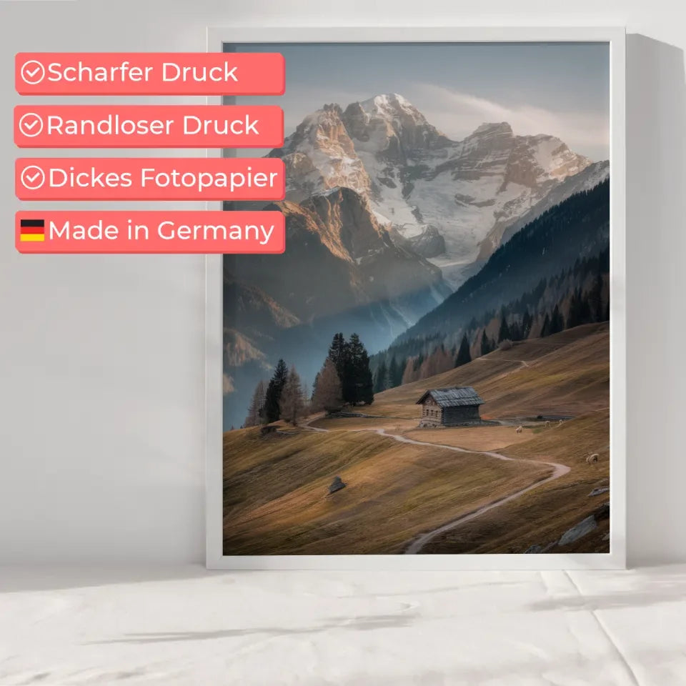 Entdecken Sie unser beeindruckendes Poster, das die Ruhe und Erhabenheit der Natur eindrucksvoll einfängt. Dieses atemberaubende Poster Berglandschaft mit Hütte und Tieren 70x50 cm zeigt eine idyllische Landschaft mit hoch aufragenden, schneebedeckten Gipfeln, die im sanften Licht der Sonne erstrahlen. Die harmonische Komposition aus warmen und kühlen Farben bringt die Schönheit der Natur direkt zu Ihnen nach Hause.