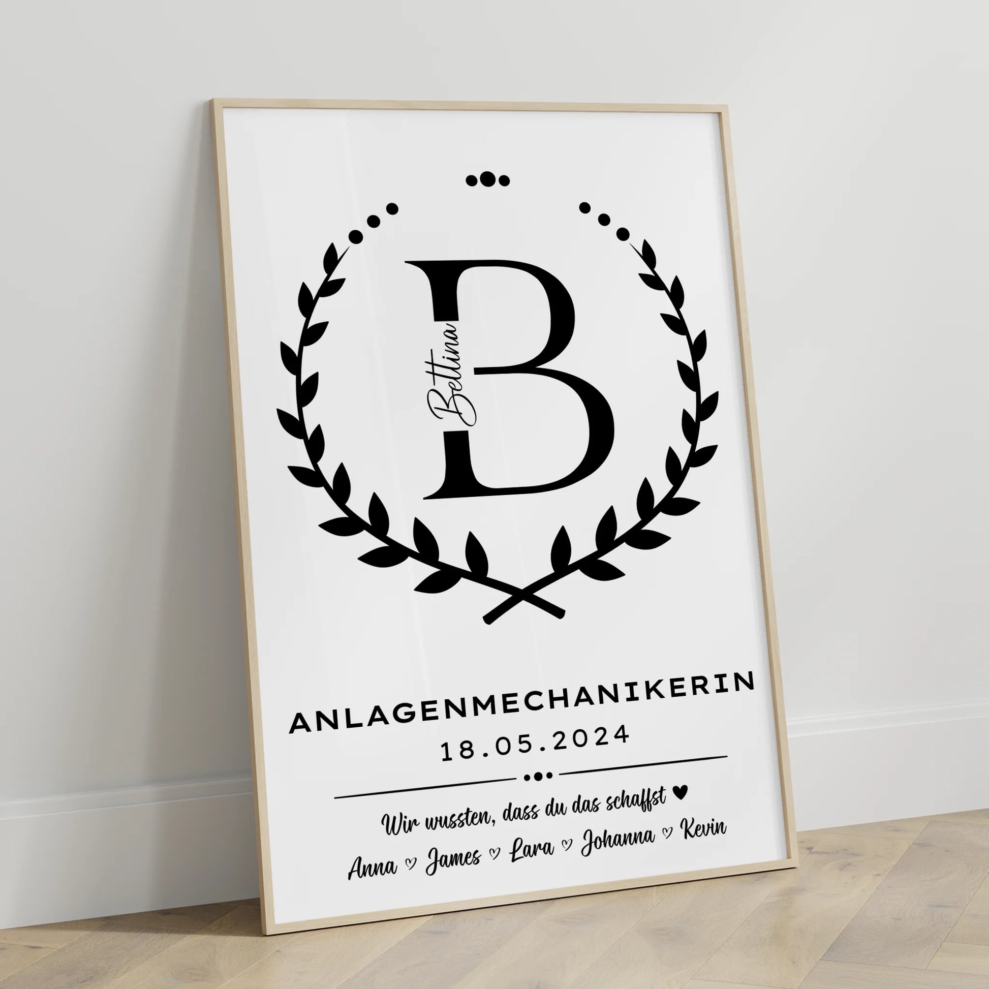 Kreiere dein ganz persönliches Ausbildungsabschluss Geschenk, indem du den Initial Buchstaben der Anlagenmechanikerin, das genaue Datum des Ausbildungsabschlusses sowie einen individuellen Wunschtext hinzufügst. So wird aus dem schlichten Poster ein emotionales Highlight, das lange in Erinnerung bleibt.