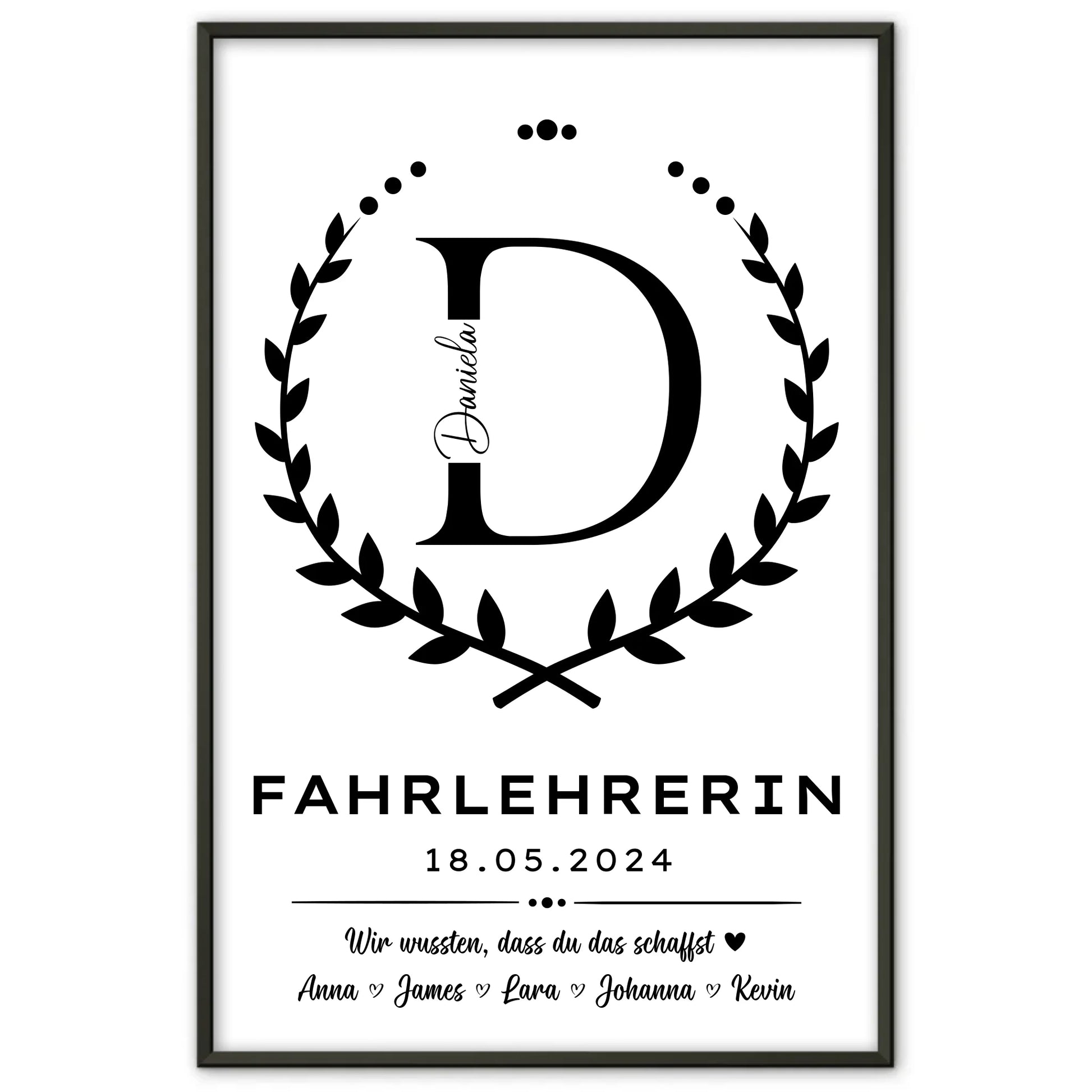 Suchst du ein einzigartiges und persönliches Ausbildungsabschluss Geschenk für eine Fahrlehrerin? Unser Ausbildungsabschluss Geschenk Fahrlehrerin Poster ist genau das Richtige für dich! Dieses individuell gestaltbare Poster kannst du mit dem Initial Buchstaben, dem Datum und einem Wunschtext personalisieren, sodass es zu einem ganz besonderen Andenken wird. Ob als Abschiedsgeschenk oder als liebevolle Erinnerung an den erfolgreichen Abschluss der Ausbildung – dieses Poster ist ein ideales Geschenk zum Abschluss Ausbildung, das garantiert Freude bereitet.